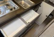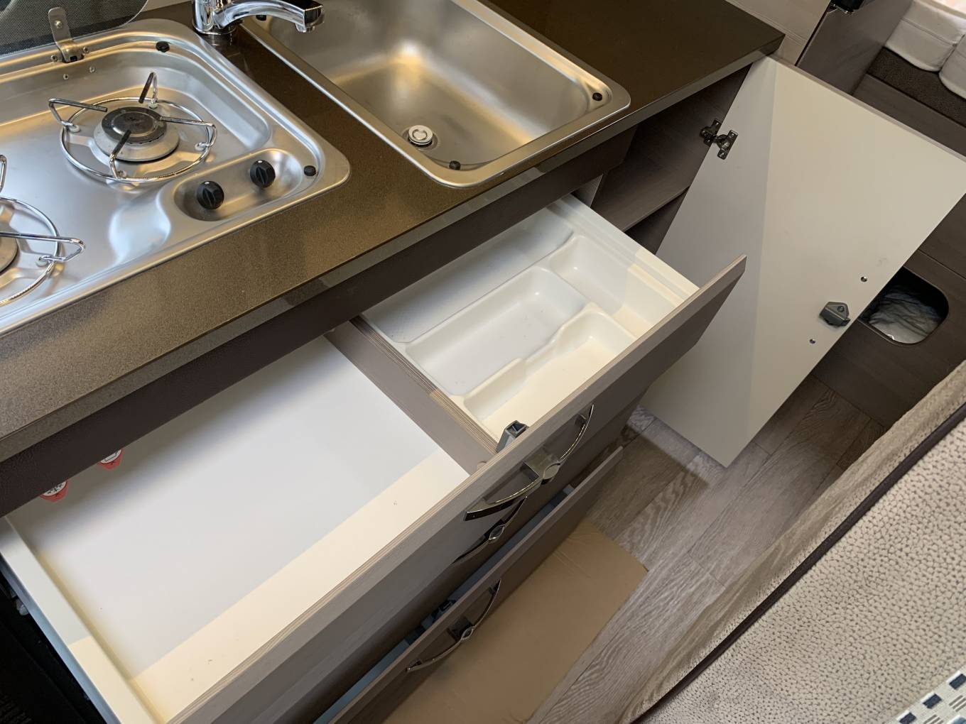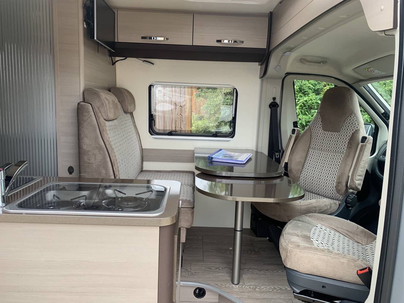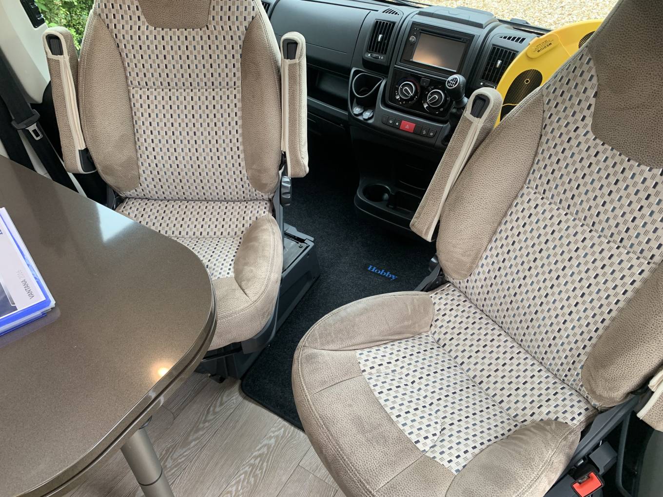 Although this is a 2 berth offering, the design incorporates what Hobby call an emergency berth, assembled by lowering the table, covering with the infill cushion and rotating the passenger seat, making an ideal childs berth.