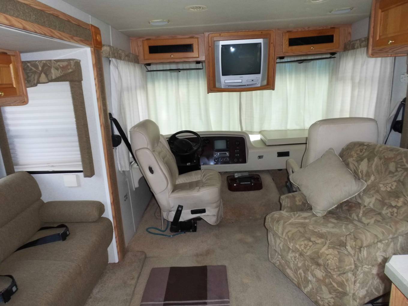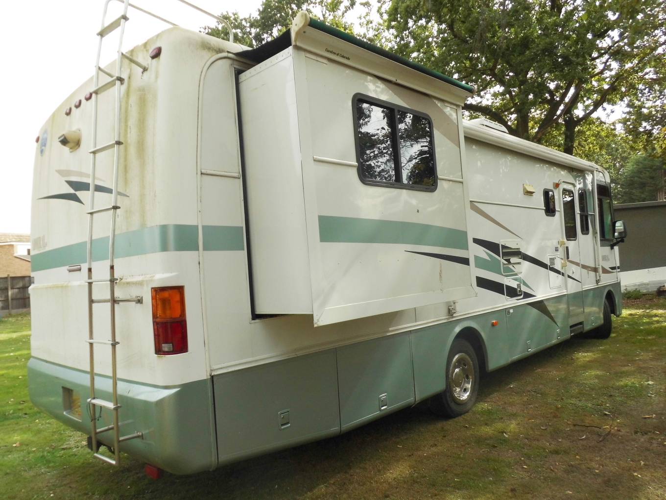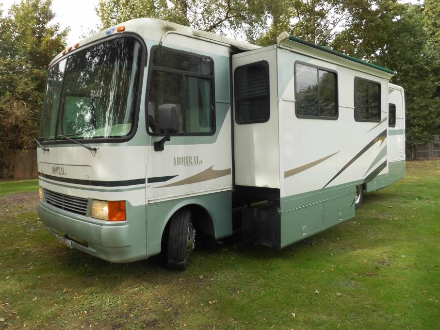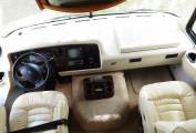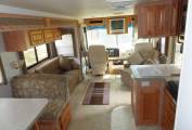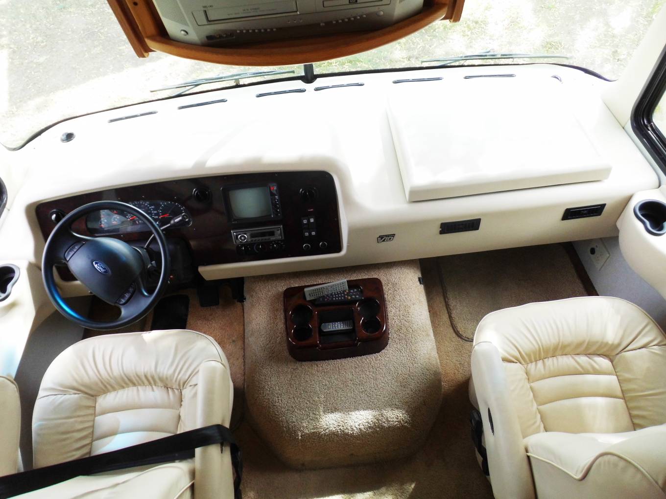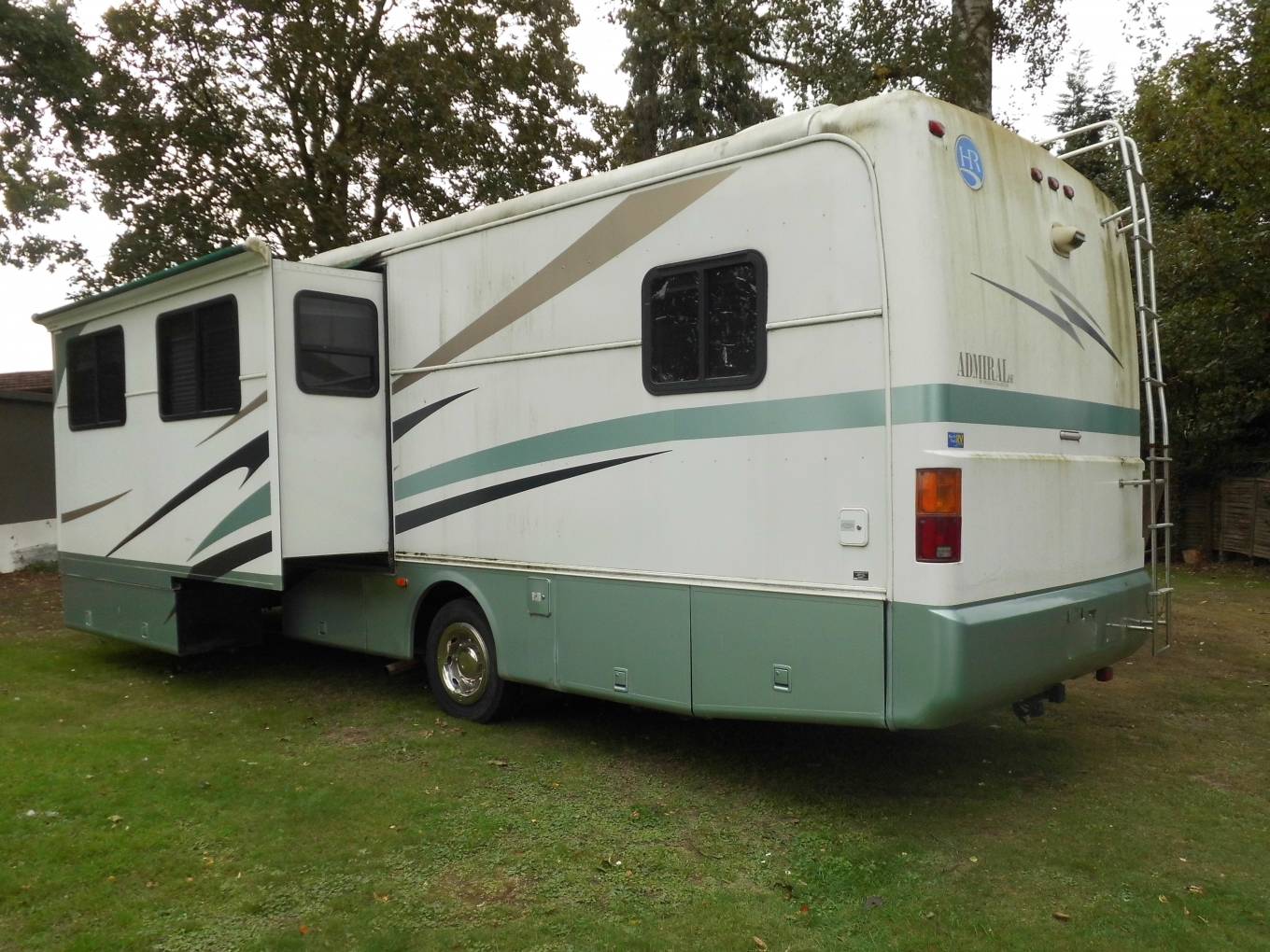 Here we have a 2003 American Holiday Rambler Admiral SE, on a Ford chassis, left hand drive with a Triton V10 engine. Featuring 2 slide outs, on-board Onan Marquis Gold 550 generator, habitation air con, service and new MOT with only 4,641 miles together with Power Gear levelling jacks. This vehicle is in excellent condition throughout. At the rear there is a ball hitch and a ladder to the roof, also a reversing camera. On the offside is the roll out canopy covering the habitation door, with fly screen. On entering this door via the electric step, on the left is the kitchen with double sink and mixer taps plus a tap for filtered water. A 3 ring hob, a Ventline extractor fan and fitted Sharp over-range microwave cooker. Next to this is the large, double door fridge-freezer. On the left is the washroom with hand basin, toilet and separate shower with hinged door. At the end is the beautiful fitted bedroom with large double bed which mechanically slides out for extra room, plenty of wardrobe and cupboard space and air conditioning fitted into the ceiling. Turning around, on the left is a large cupboard with plumbing for a washing machine or dishwasher, next to this is more cupboard and drawer space. Entering the lounge-dining area is the table with seating for 4. Further on is a sofa with 3 lap belts which converts into a double bed and mechanically slides out for extra living space, together with air conditioning in the ceiling for warmer days. Opposite, is the single Captain lounge seat, this area is surrounded by Venetian style blinds. Entering the cab area are the leather driver and passenger seats, which have 3 point seat belts, the driver’s seat is a Captain seat. There is a reversing camera within the leather dashboard and a large TV fitted in the upper cabinets, lounge type curtains surround the inner cab for privacy. There is a lovely bright and spacious feeling to this motorhome with fitted carpets and warm air heating throughout for all season comfort. Lots of storage cabinets and drawers at high and low level also useful storage boxes around the outside of the vehicle