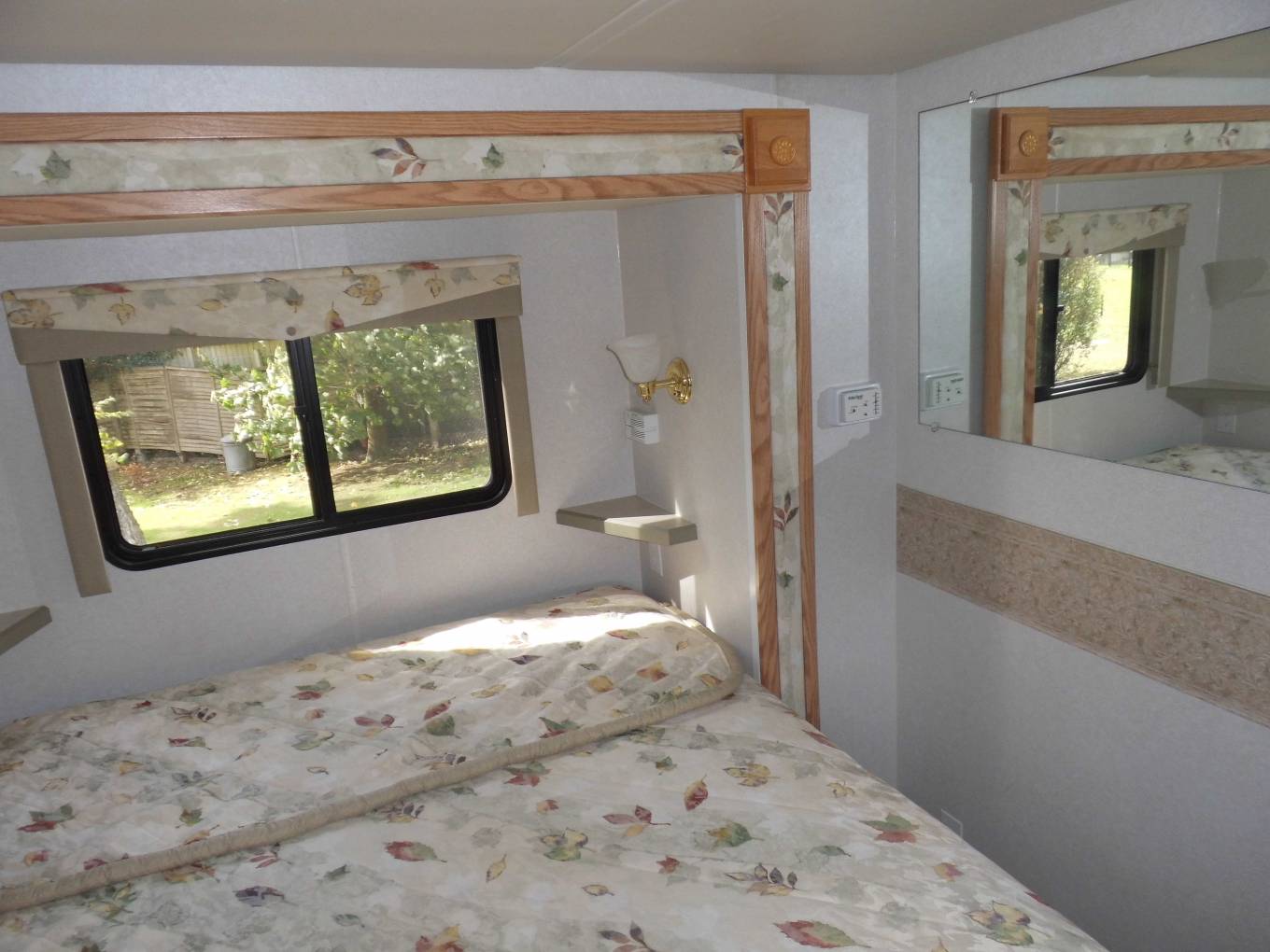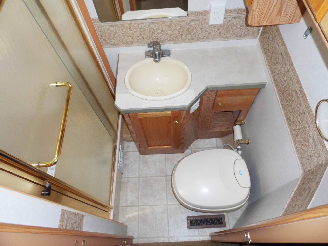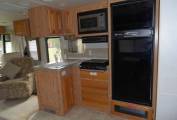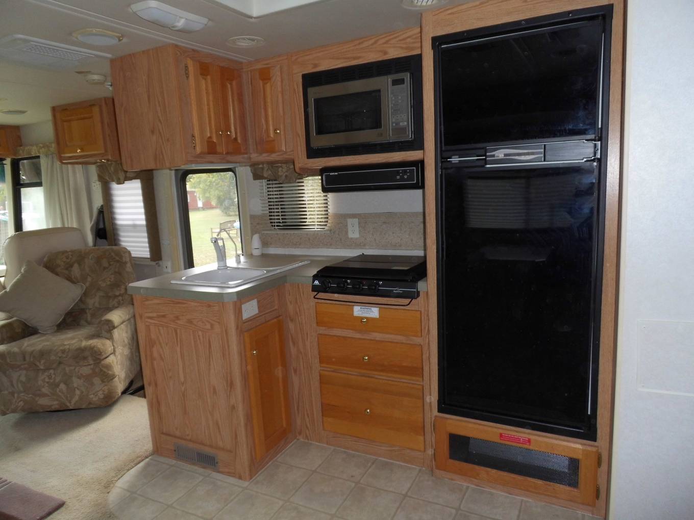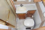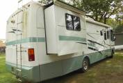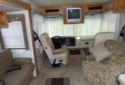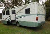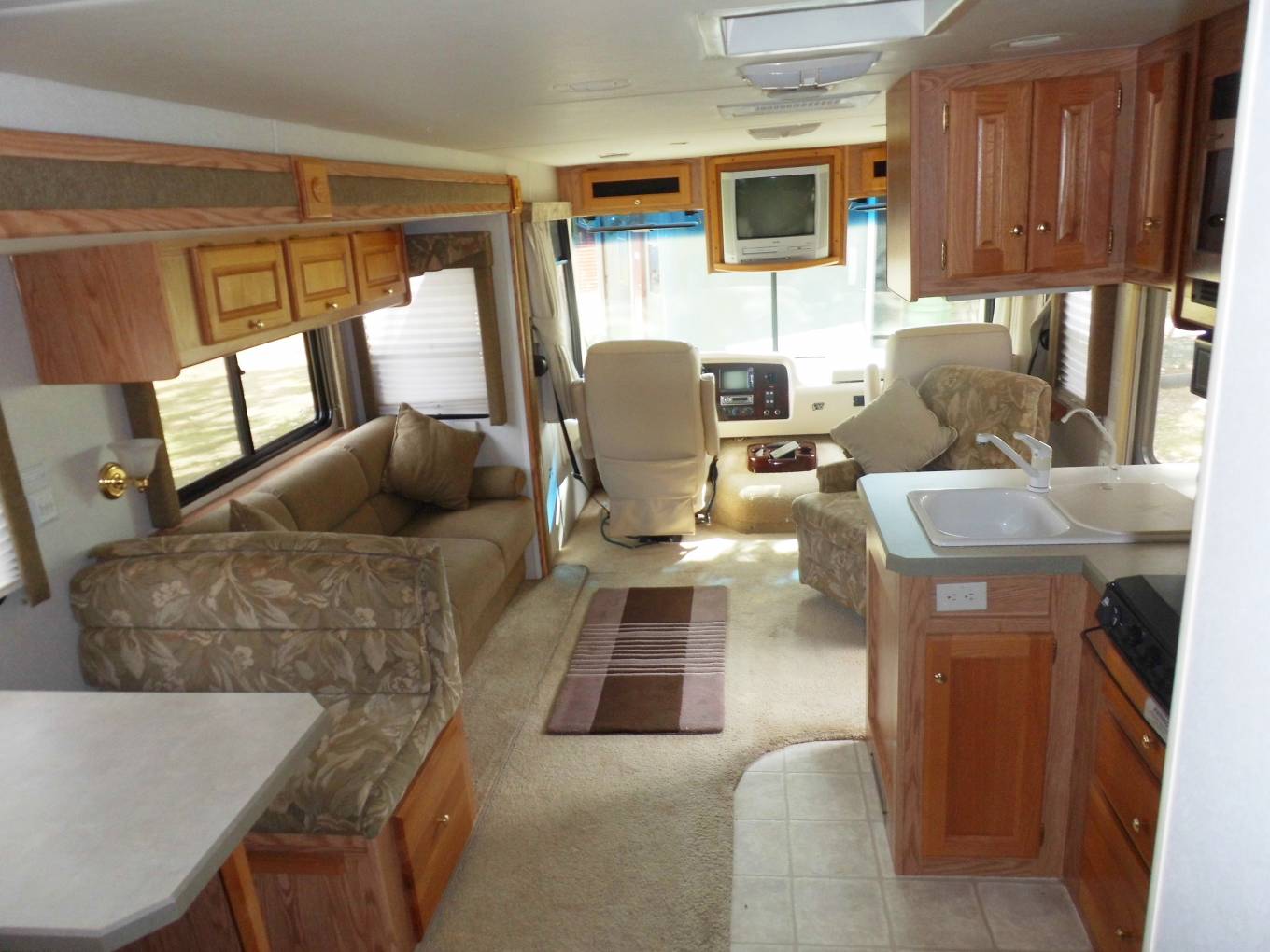 Here we have a 2003 American Holiday Rambler Admiral SE, on a Ford chassis, left hand drive with a Triton V10 engine. Featuring 2 slide outs, on-board Onan Marquis Gold 550 generator, habitation air con, service and new MOT with only 4,641 miles together with Power Gear levelling jacks. This vehicle is in excellent condition throughout. At the rear there is a ball hitch and a ladder to the roof, also a reversing camera. On the offside is the roll out canopy covering the habitation door, with fly screen. On entering this door via the electric step, on the left is the kitchen with double sink and mixer taps plus a tap for filtered water. A 3 ring hob, a Ventline extractor fan and fitted Sharp over-range microwave cooker. Next to this is the large, double door fridge-freezer. On the left is the washroom with hand basin, toilet and separate shower with hinged door. At the end is the beautiful fitted bedroom with large double bed which mechanically slides out for extra room, plenty of wardrobe and cupboard space and air conditioning fitted into the ceiling. Turning around, on the left is a large cupboard with plumbing for a washing machine or dishwasher, next to this is more cupboard and drawer space. Entering the lounge-dining area is the table with seating for 4. Further on is a sofa with 3 lap belts which converts into a double bed and mechanically slides out for extra living space, together with air conditioning in the ceiling for warmer days. Opposite, is the single Captain lounge seat, this area is surrounded by Venetian style blinds. Entering the cab area are the leather driver and passenger seats, which have 3 point seat belts, the driver’s seat is a Captain seat. There is a reversing camera within the leather dashboard and a large TV fitted in the upper cabinets, lounge type curtains surround the inner cab for privacy. There is a lovely bright and spacious feeling to this motorhome with fitted carpets and warm air heating throughout for all season comfort. Lots of storage cabinets and drawers at high and low level also useful storage boxes around the outside of the vehicle