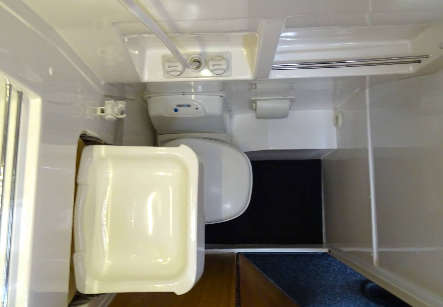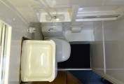 The bathroom is a wetroom style, featuring a good sized shower tray with shower handset connected, a fold down washbasin and a Thetford cassette toilet.
