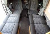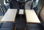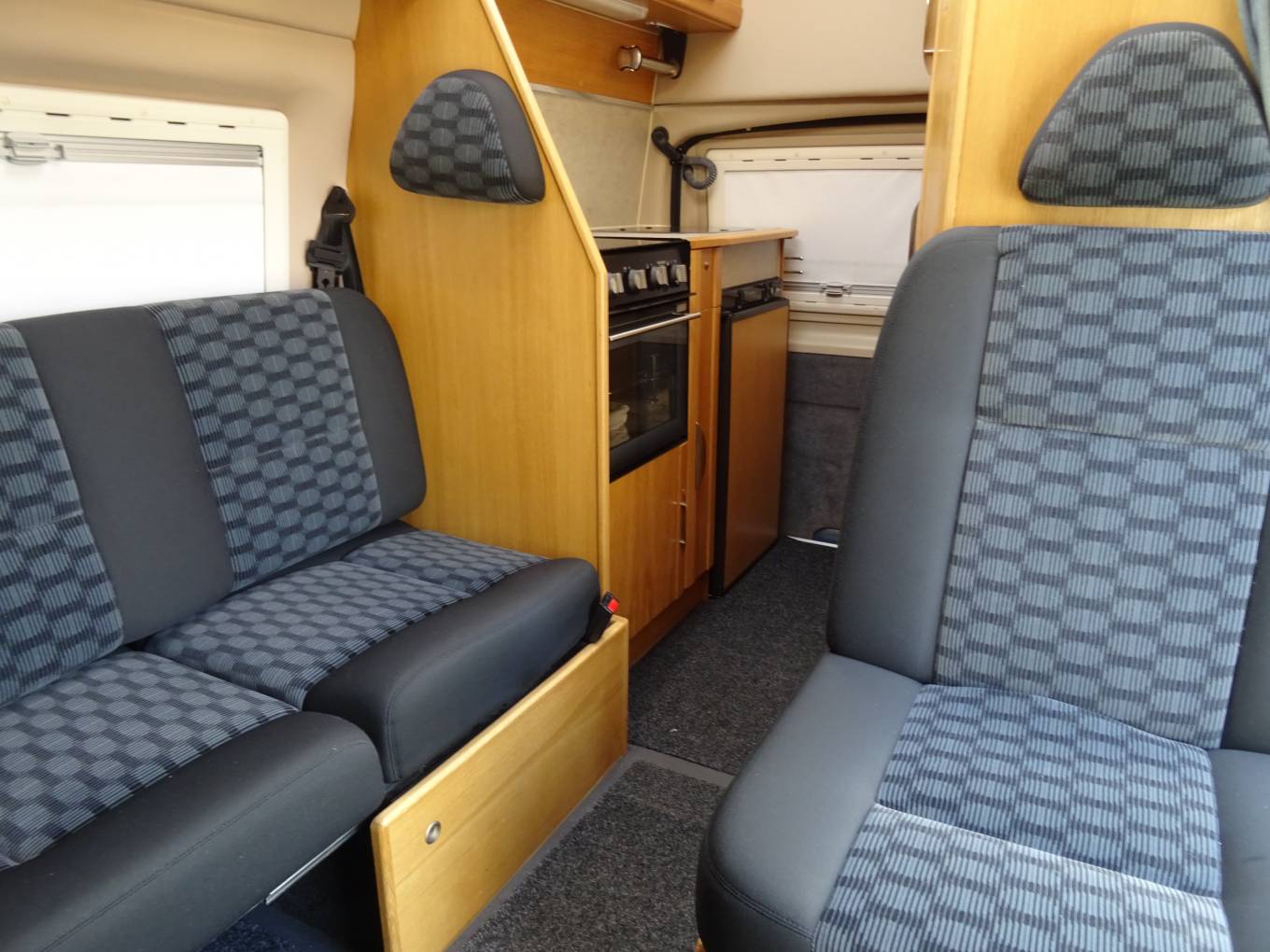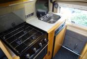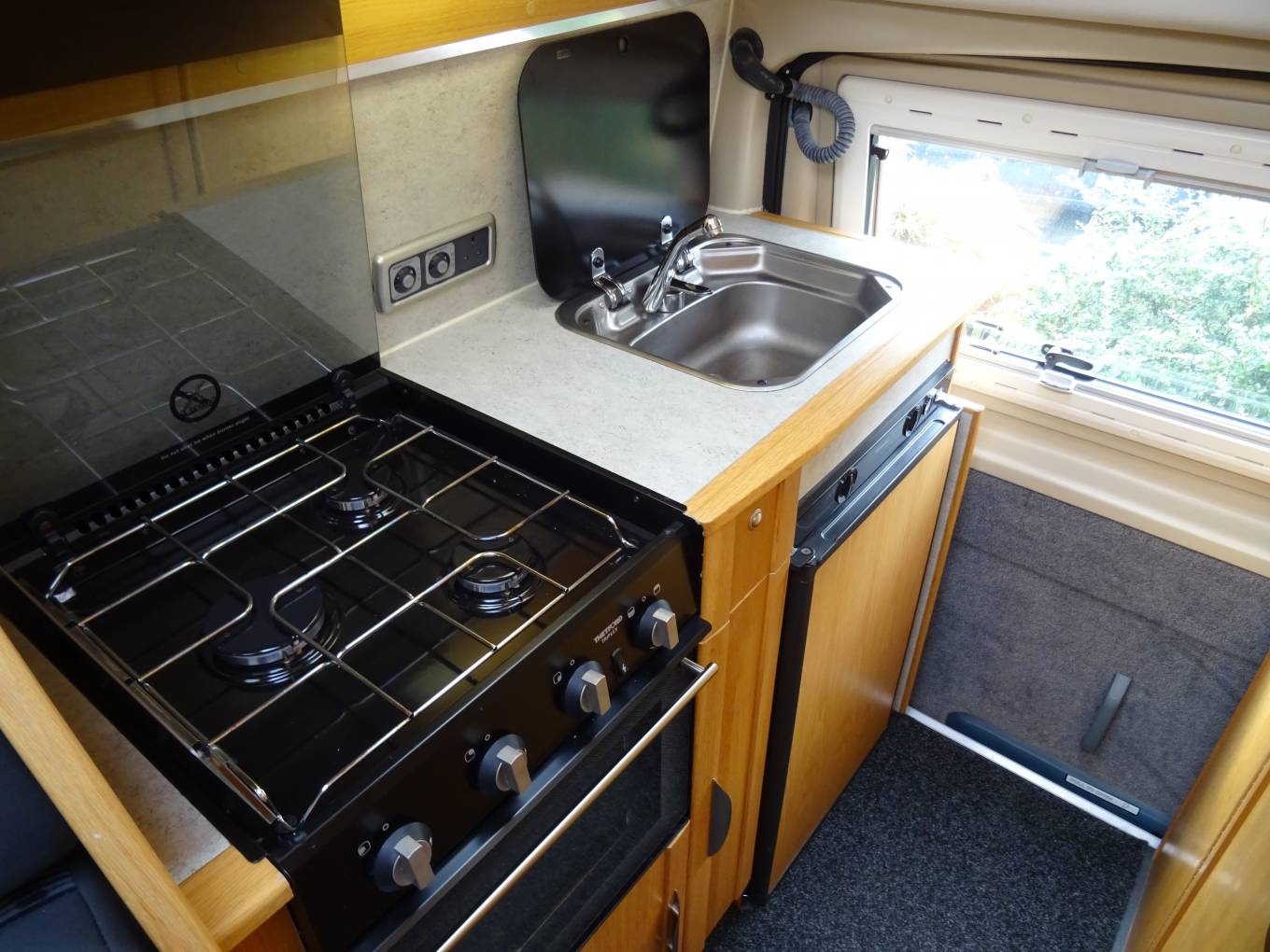 Open the side sliding door, step inside to the lounge and dining area, with a side sofa opposite which can cleverly convert into a single seat with a 3 point seat belt. By the sliding door there is an additional forward facing single seat that also has a 3 point seatbelt. There are 2 large dining tables which stow away when not in use and also an occasional coffee table that can be used between the front seats. This area converts to two single beds or a large double bed in the evening. There are storage areas beneath the seats, a large storage cabinet above the cab and a HEKI II opening sunroof floods the lounge with natural daylight. The kitchen is well appointed with a 3 gas burner, full sized gas oven with grill beneath and a good sized kitchen sink with chrome mixer tap. Below the counter a three-way powered fridge with ice-box that can run on 240v, 12v or gas depending whether you are plugged in on site or wild camping. Upper cabinets and lower cupboards provide plenty of room for all your essentials and holiday provisions with an additional work surface that can fold down when needed.