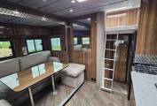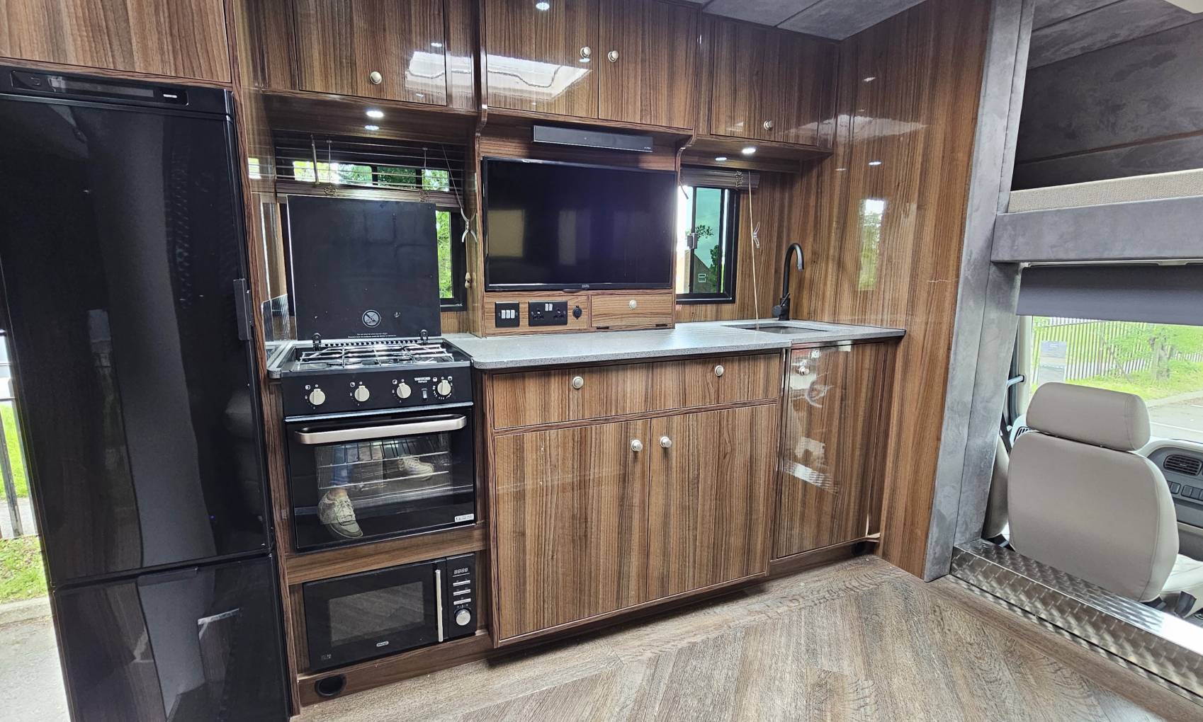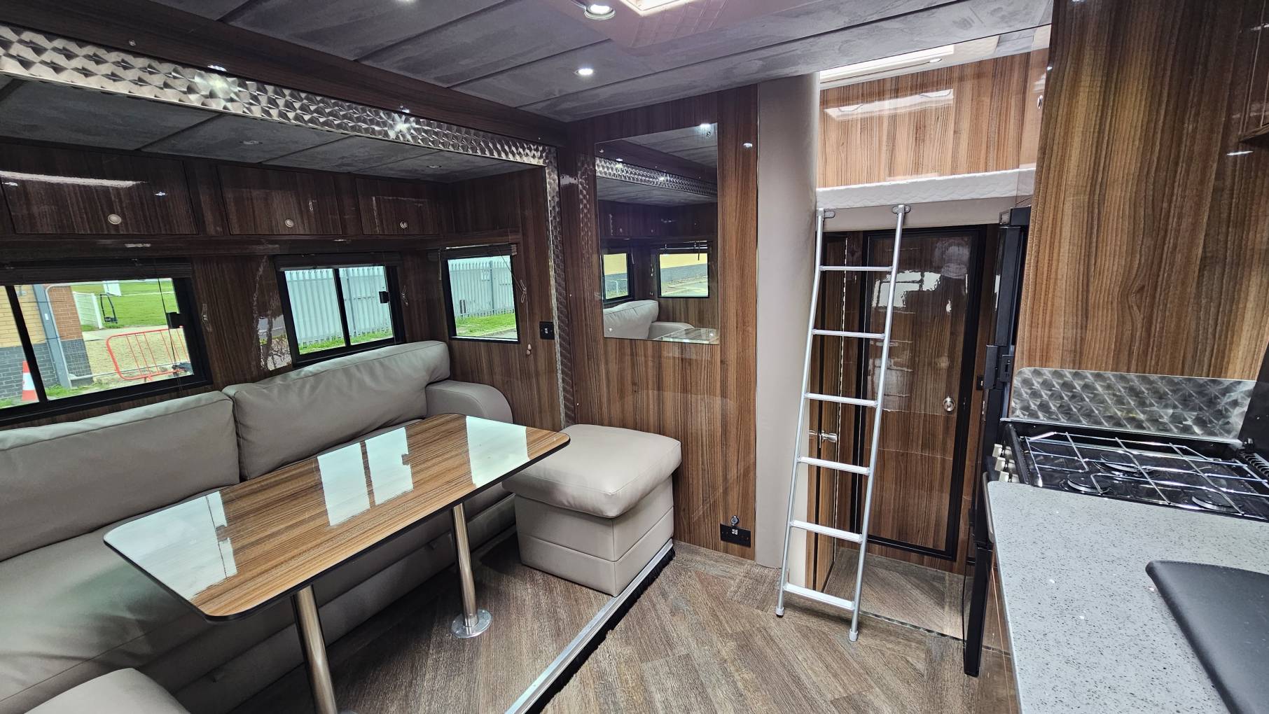 The tuck is fully loaded with living accommodation for 6 berths and 3 travelling seats. The spec is huge on this stunning motor, but what draws you in, is the absolutely massive garage to the rear. Big enough for any motorsports teams.