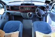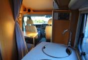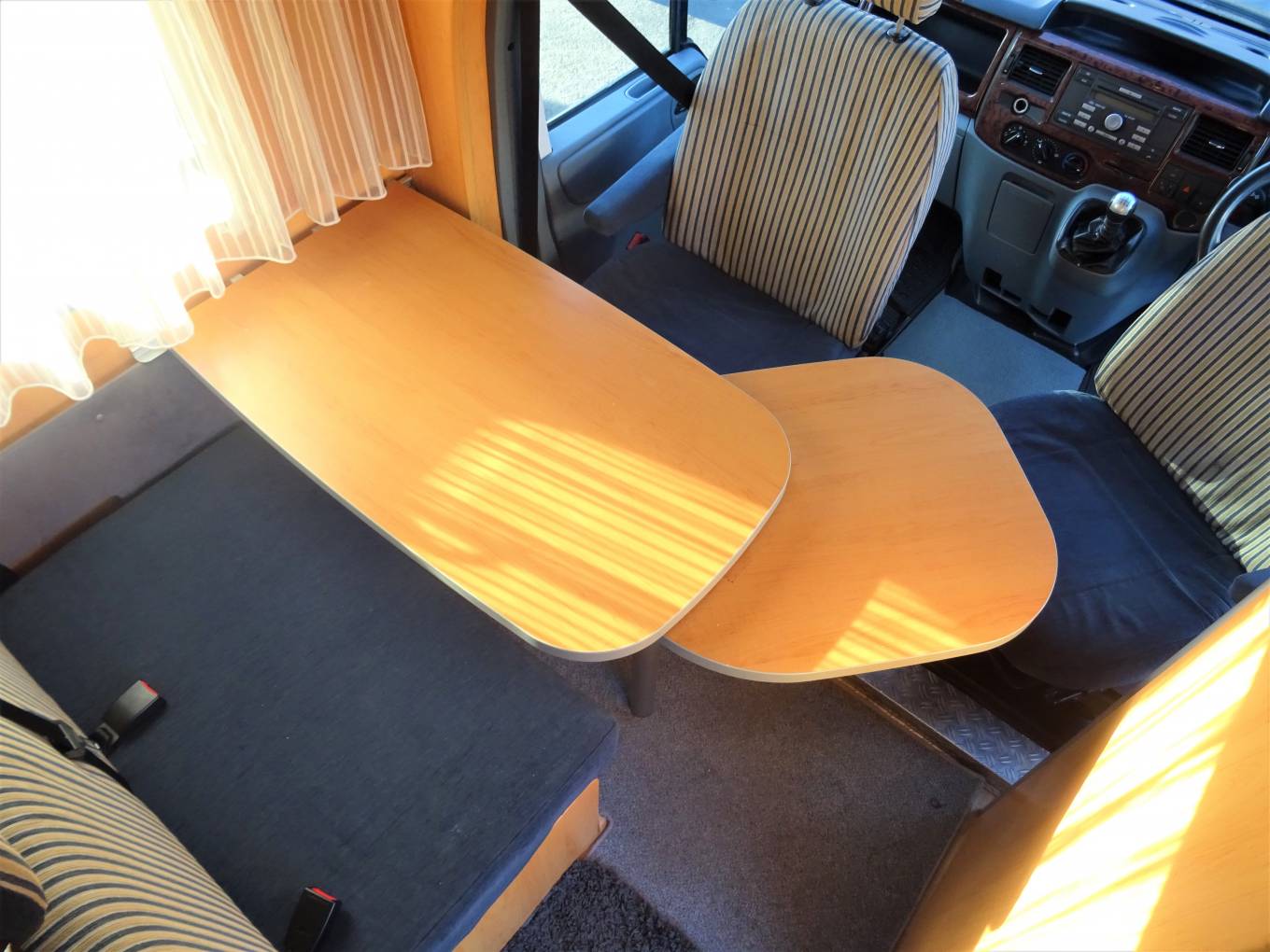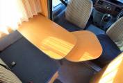 Heading towards the front of the motorhome, there are the extra 2 traveling seats with a slide out table that connects to the front 2 travel seats that both swivel round for that warm family feel. For the third berth, the table drops down and the side cushions are placed on top to form the large single bed. Also in this area is the wardrobe, microwave and TV unit.
