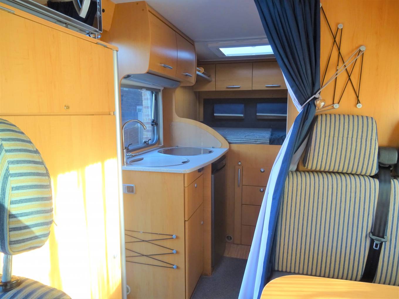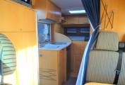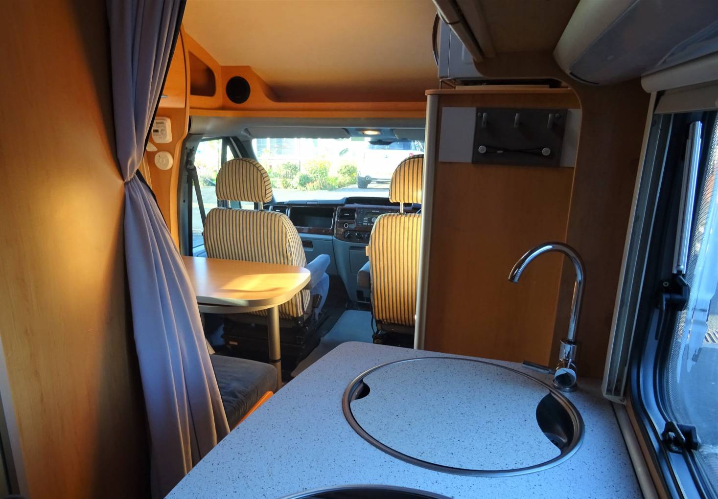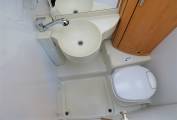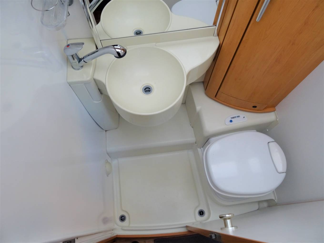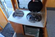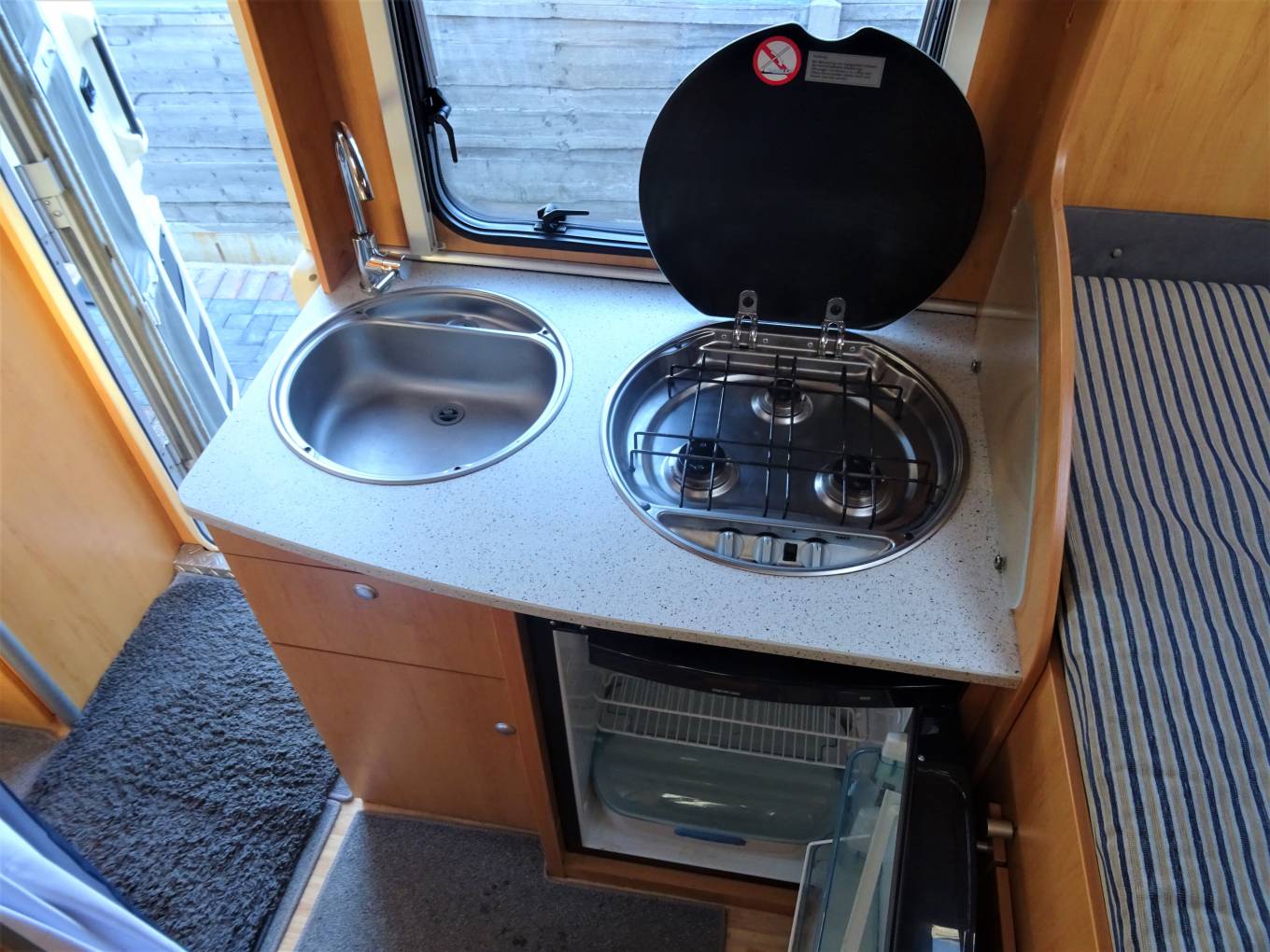 Moving through to the centre of the motorhome, there is a 3 ring gas hob supplied from the refillable LPG tank located in the exterior storage unit. Next to the cooker is the sink with a good sized fridge with freezer compartment located underneath. Opposite this area is the washroom with a toilet, sink and shower with a large storage cupboard too.