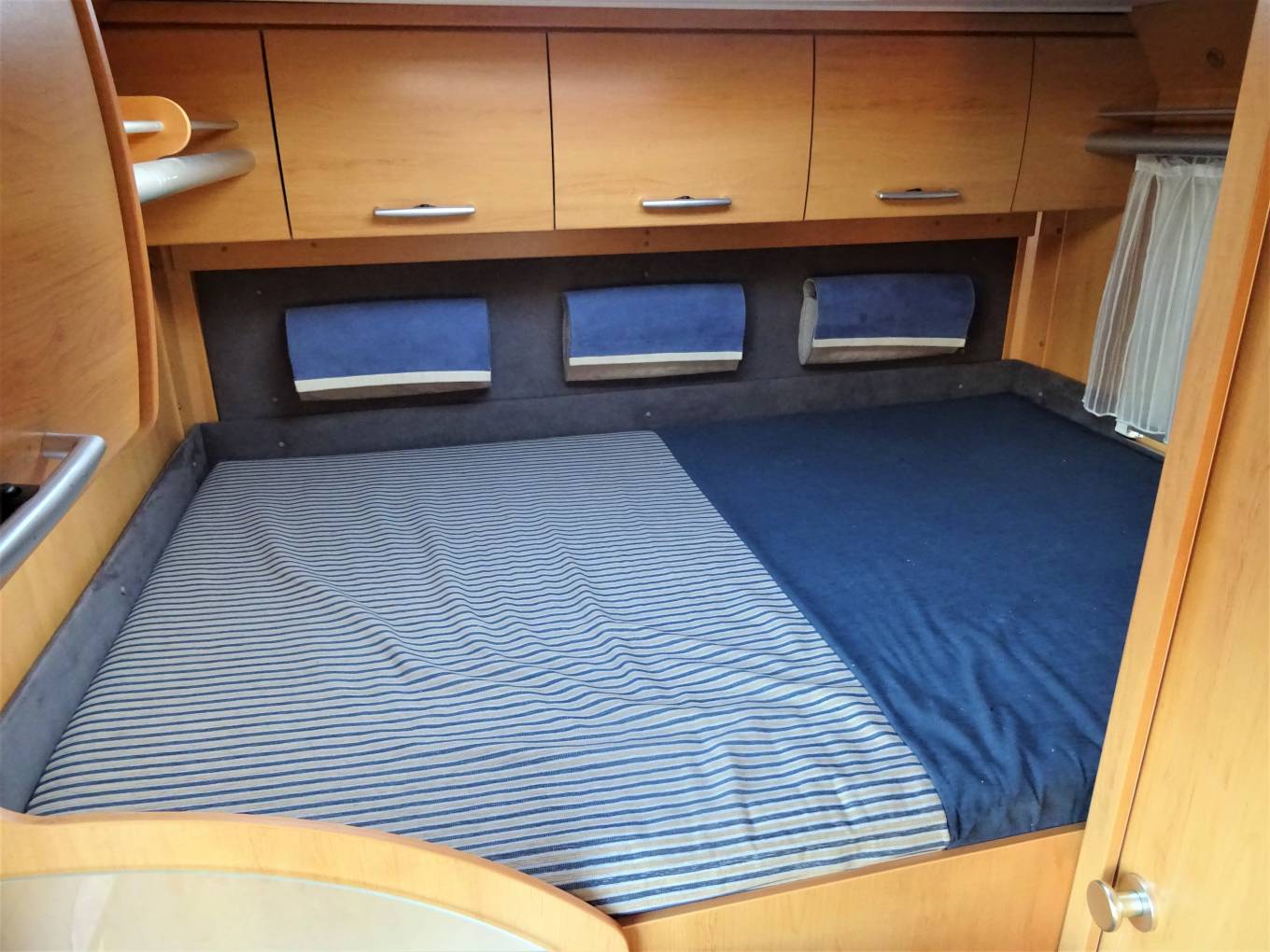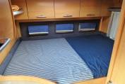 Starting with the rear of the motorhome, you have a fixed elevated double bed surrounded by multiple spot lights with plenty of storage space in the overhead cupboards. Underneath the bed is the large garage which has plenty of room for things such as the drive away awning, luggage or bikes.