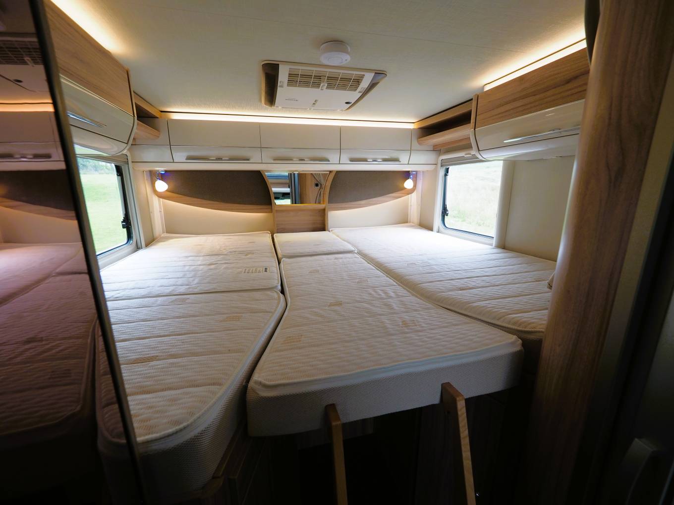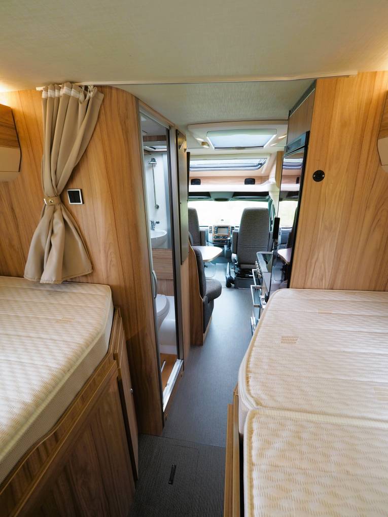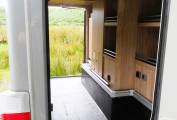 Useful cupboard space features either side of the steps. A third sleeping berth can
