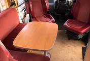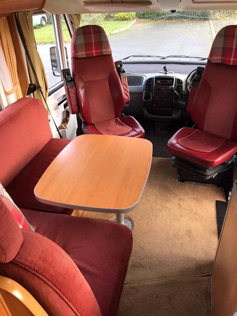 The habitation door is on the off-side behind the drivers seat. On entering into the airy dining/seating area with a L shape seat and with the passenger and drivers seats that swivel it creates and great area to dine and relax in.