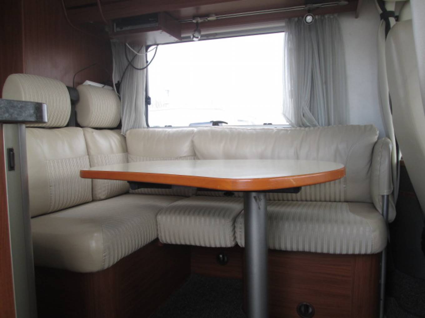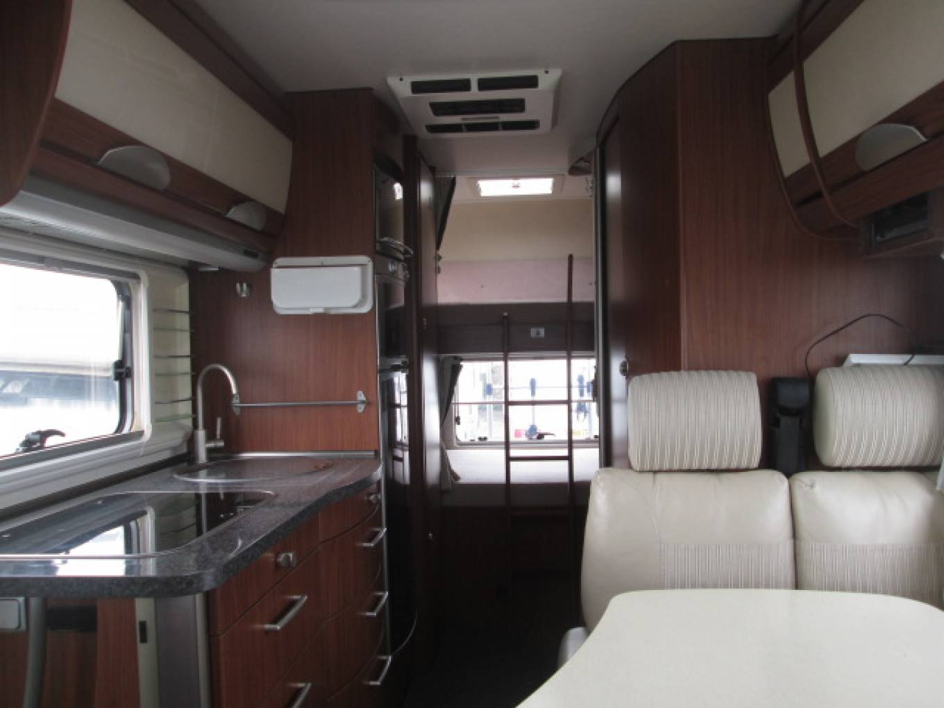 Sleeping is via the Rear Adult Size Bunk Beds or via the Very Large Pull-Down Luxury bed situated above the cab