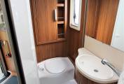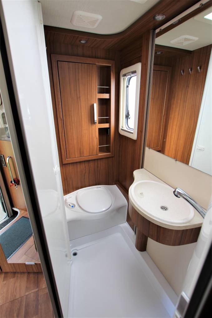 A large toilet and shower room in the corner with Thetford (XL) cassette toilet, shower and vanity sink.