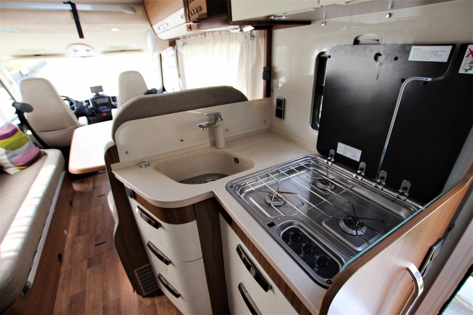The bright and airy lounge with huge windows gives ample space for dining and relaxing, 2 side facing sofas for lounging will convert to single sleeping along with the huge pull down bed to accommodate 3- 4 berths. The motorhome is fitted with 4 travelling seat belts.