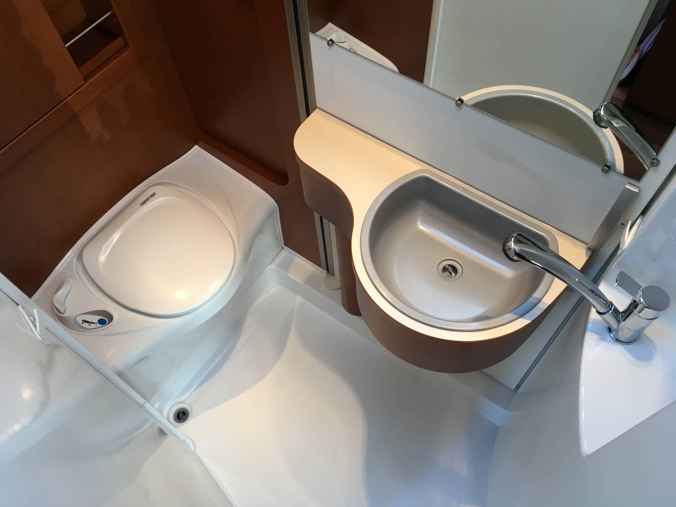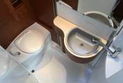 The deceptive corner washroom has a clever double use design for the space it actually uses. There’s a Thetford bench toilet on the back wall and you can make the whole rest of the room into a shower cubicle thanks to ingenious swinging partition.The tambour door looks good and is great for space-efficiency and its waterproof qualities.Storage is generous in here, as indeed it is throughout the rest of a vehicle that has obviously been well thought out for the end users.