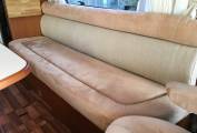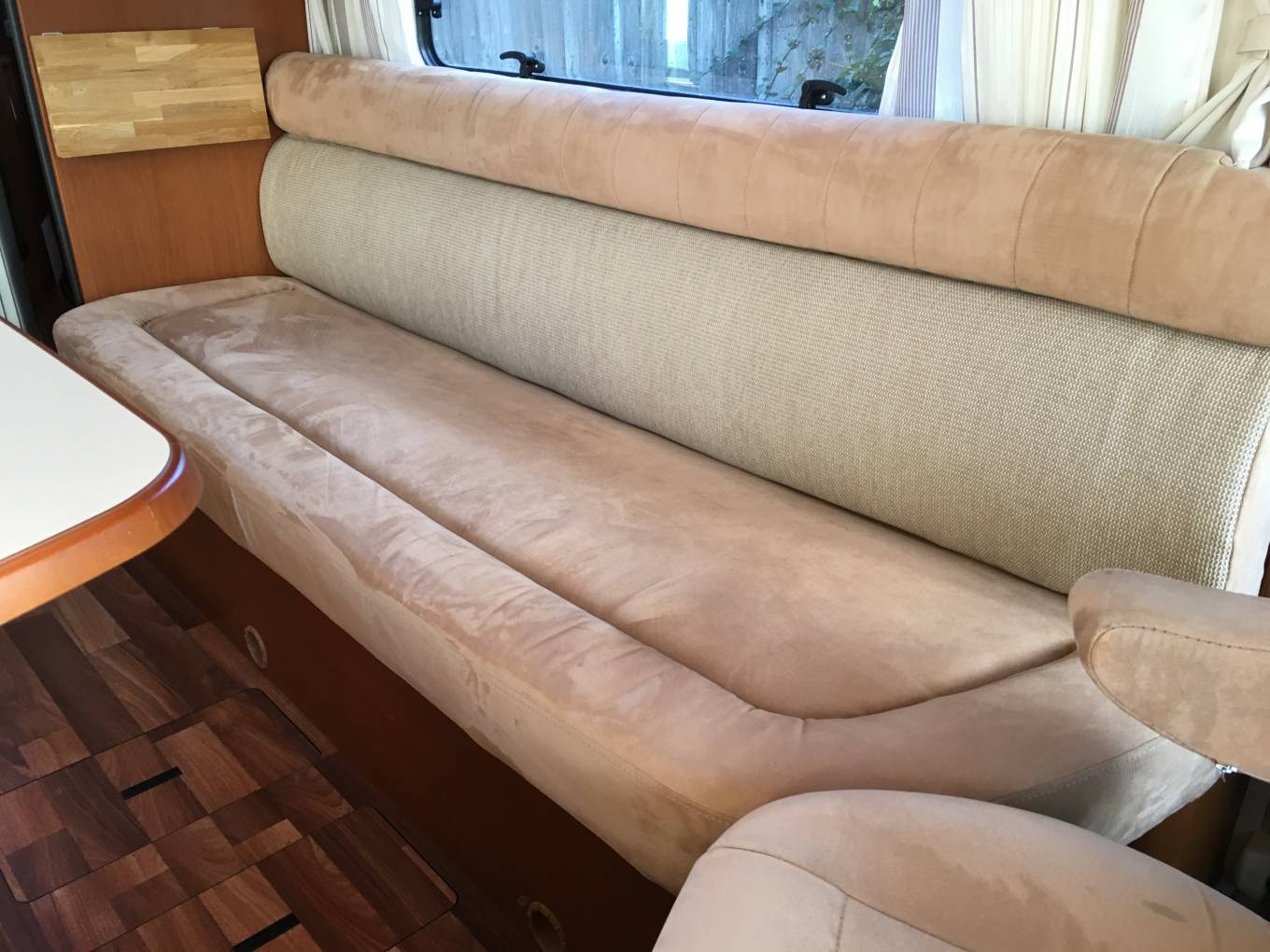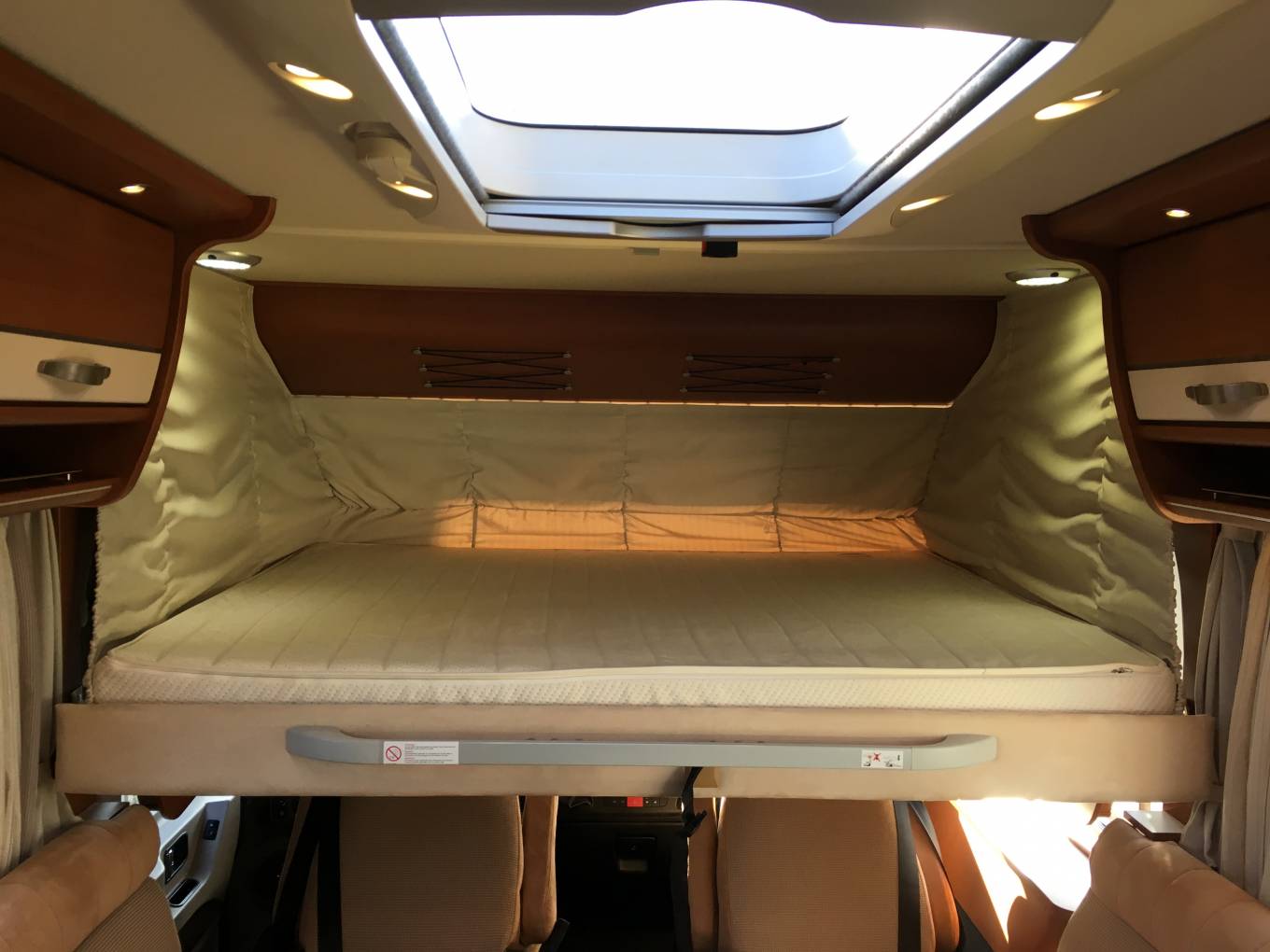 The spacious double bed, which Hymer claimed is the largest one of its kind in the class at the time of manufacture, effortlessly pulls down above the driver’s folding forward cab seats and is very comfortable.The long sofa in the lounge can be used to make up the third bed.