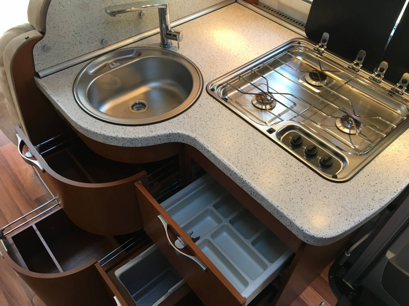 The well equipped kitchen is compact but includes circular sink with chrome mixer tap, removable chopping board, three gas burner hob and opposite is the fantastic, large fridge freezer, part of the Dometic Tec Tower, fridge,freezer,grill,oven combo.