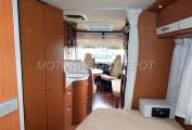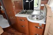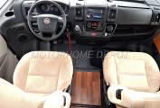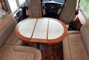 We enter the motorhome on the off side via an electric step, immediately to the right is the dinette, this consists of a long sofa to the right of the habitation door, opposite is an L shaped sofa the forward facing section has 2 x 3 point lap & diagonal seat belts for travelling passengers. The front two seats rotate to join this area so you could easily seat 7 people around the table if entertaining on site. The table has a clever extending leaf which would have been a cost option on this model. Above the cab is a large full width double bed which drops manually and is accessed via the sofa.