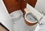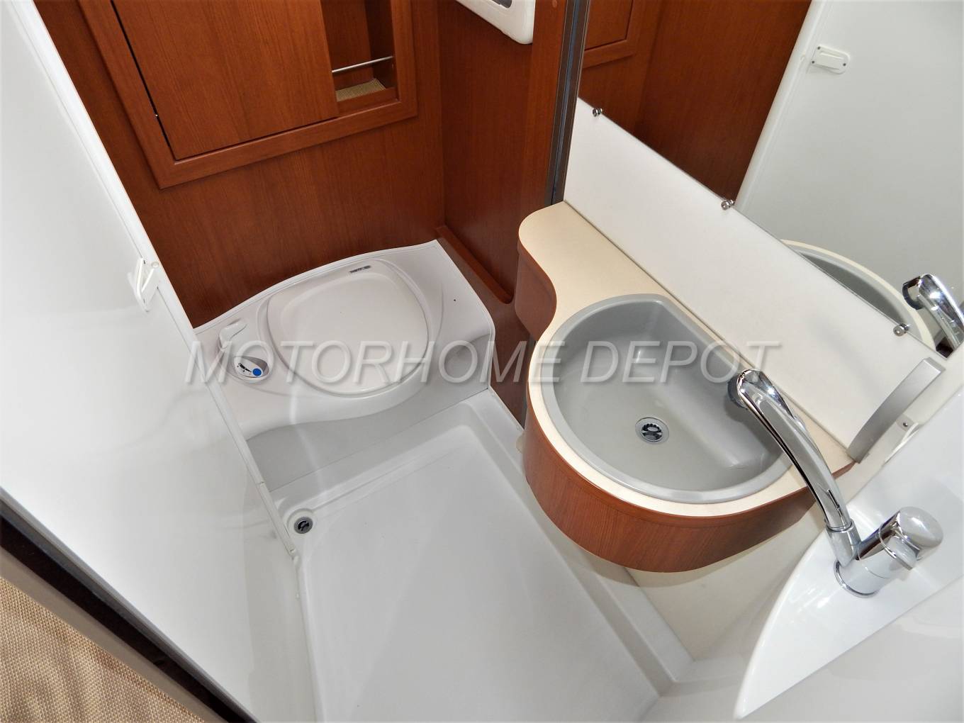 Moving rear again the bedroom area which consists of a French bed on the off side, this can be lifted to reveal the storage below, opposite a large wardrobe and the bathroom. The bathroom consists of a Thetford fresh water flush toilet a grey wash hand basin situated on a rotating wall which moves across to form the shower wall. This keeps the toilet area dry when in use. The chrome mixer tap extends to give the shower head.
