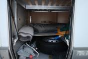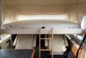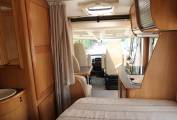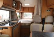 Internally the first thing that strikes you is how light and airy this motorhome feels. It is compact in length at only 6.2 metres making it easy to drive and park but when you are inside it feels deceptively larger. The layout consists of a fixed rear French bed that measures 76 x 53 inches and if you lift the bed frame up which is on power struts you have access to the garage below. There are 4 overhead lockers providing additional storage.