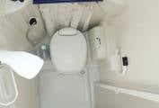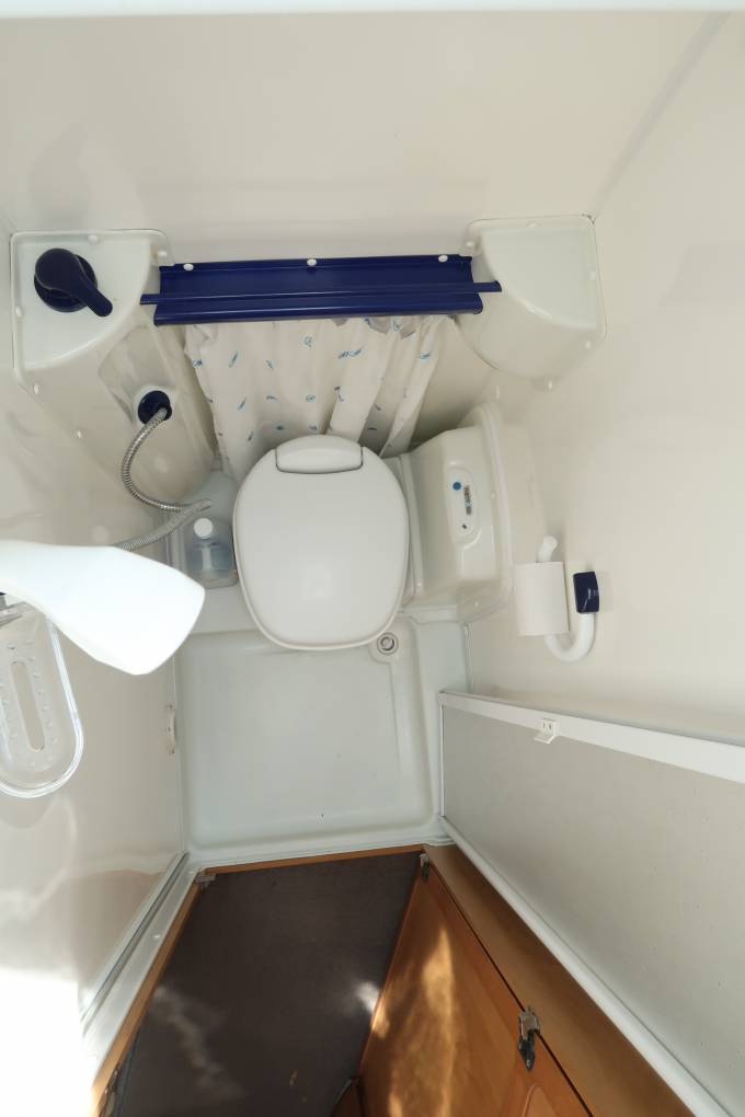Next to the rear bed is the washroom which has a shower with a pespex screen and a Thetford cassette toilet. As you exit the washroom you have a wash basin with a mixer tap, a large mirror and a bathroom storage cupboard and beside this is a full length wardrobe with a hanging rail for your clothes.