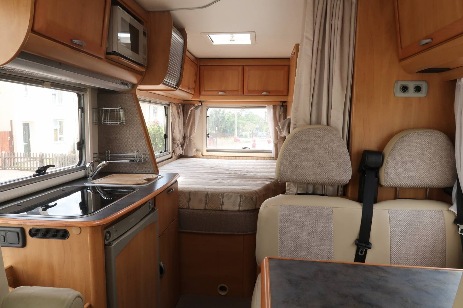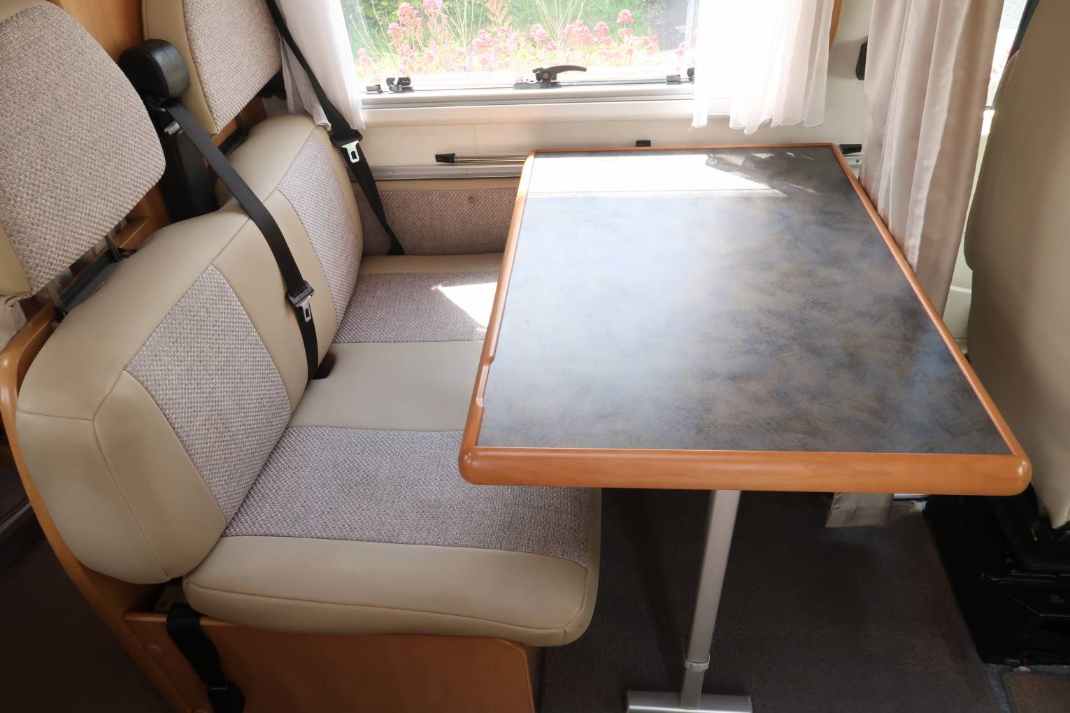 One of the standout features of this delightful motorhome is the lounge dinette. This is a lovely light area to sit and relax with a drink or meal after a day out. There is a forward facing two seater sofa that is fitted with two seat belts and both front seats swivel enabling you to sit 4 people around the substantial dining table in real comfort. For a vehicle of its age the upholstery is in very good condition and may well have been re-upholstered in the past. Above the cab is a drop down bed which is cavernous and measures 74 x 53 inches and provides 2 adults with plenty of headroom. When not in use this pushes back up into the ceiling giving driver and passenger plenty of headroom.