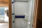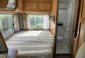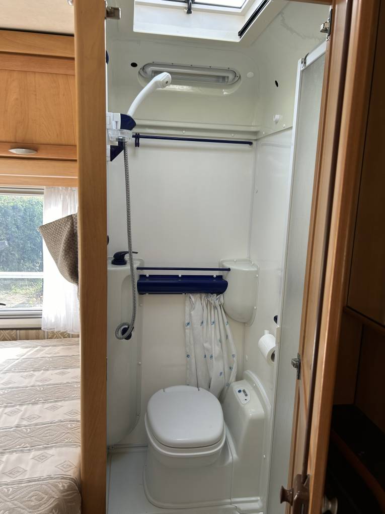 Next to the rear bed is the washroom which has a shower with a pespex screen and a Thetford cassette toilet. As you exit the washroom you have a wash basin with a mixer tap, a large mirror and a bathroom storage cupboard and beside this is a full length wardrobe with a hanging rail for your clothes.