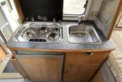 The mid-kitchen has a microwave oven and a 3 gas burner hob for your cooking requirements as well as a 3-way fridge with an ice box. There is a stainless steel sink with a mixer tap and a generous amount of cupboard space for your pots and pans and kitchen essentials.