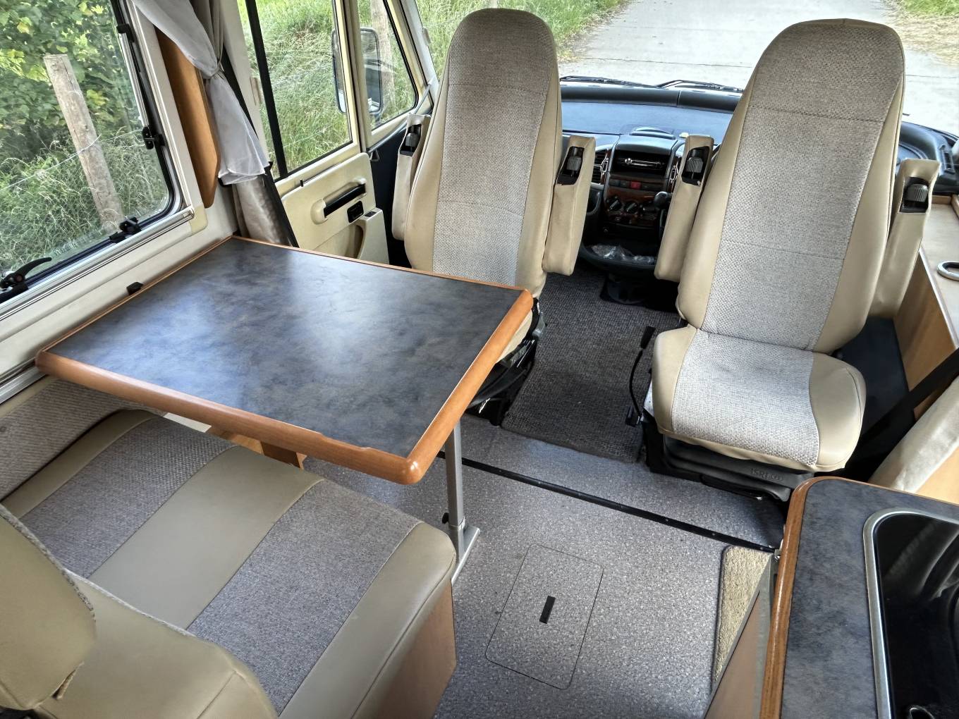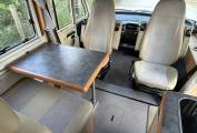 One of the standout features of this delightful motorhome is the lounge dinette. This is a lovely light area to sit and relax with a drink or meal after a day out. There is a forward facing two seater sofa that is fitted with two seat belts and both front seats swivel enabling you to sit 4 people around the substantial dining table in real comfort. For a vehicle of its age the upholstery is in very good condition and may well have been re-upholstered in the past. Above the cab is a drop down bed which is cavernous and measures 74 x 53 inches and provides 2 adults with plenty of headroom. When not in use this pushes back up into the ceiling giving driver and passenger plenty of headroom.