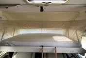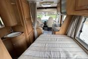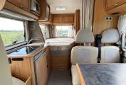 Internally the first thing that strikes you is how light and airy this motorhome feels. It is compact in length at only 6.2 metres making it easy to drive and park but when you are inside it feels deceptively larger. The layout consists of a fixed rear French bed that measures 76 x 53 inches and if you lift the bed frame up which is on power struts you have access to the garage below. There are 4 overhead lockers providing additional storage.