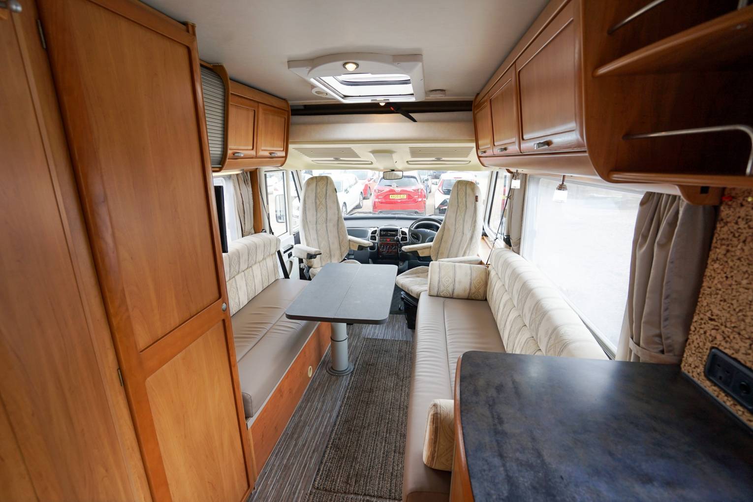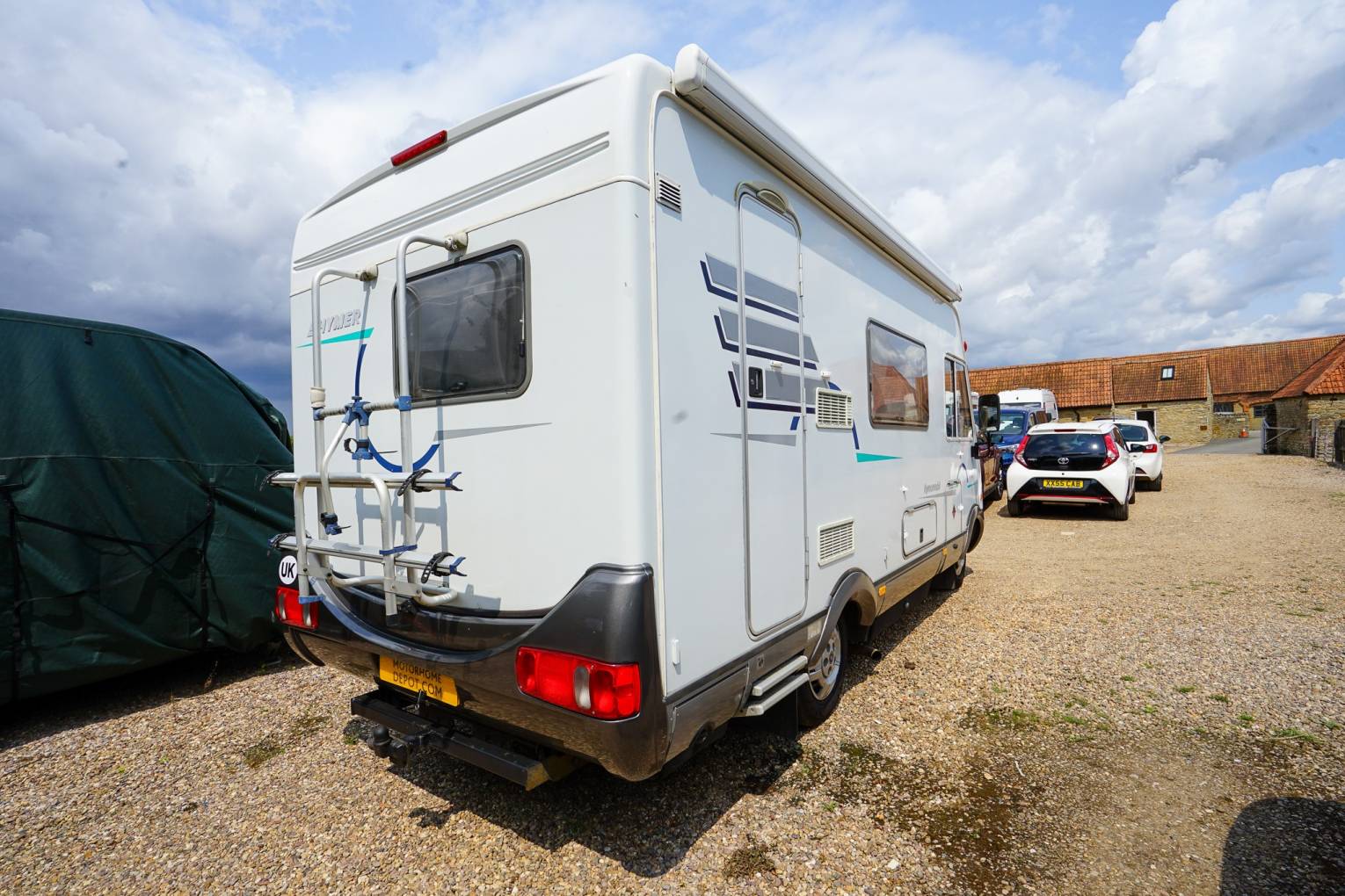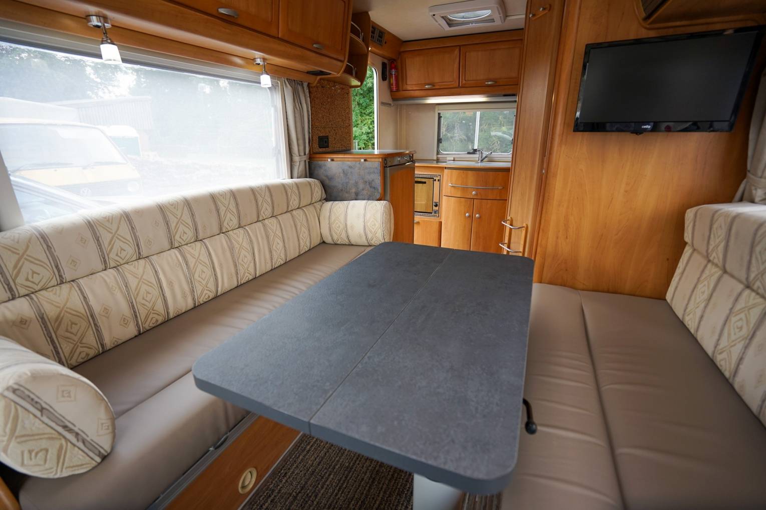 2003 Hymer B584 RHD 4 Berth Bespoke layout A Class Motorhome from probably the most famous name in the motorhome industry renowned for their design and German build quality. This unique B584 layout has been professionally reconfigured in 2021 to provide 4 Berths and 2 long opposing sofa’s to provide both more living room and an extra berth over the standard model. All reupholstered at the same time. It comes with a Solar Panel, Reverse Camera, Oyster Satellite dish, tow bar, Bike Rack, TV/DVD, MaxxAir 2 way Roof fan with remote, Windout Awning and Spare wheel.