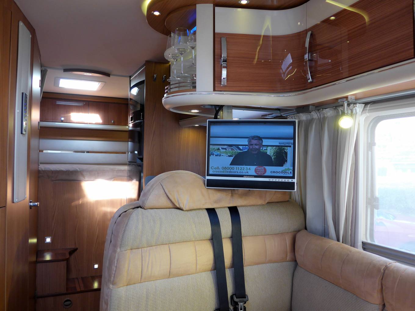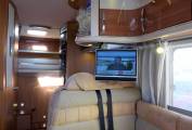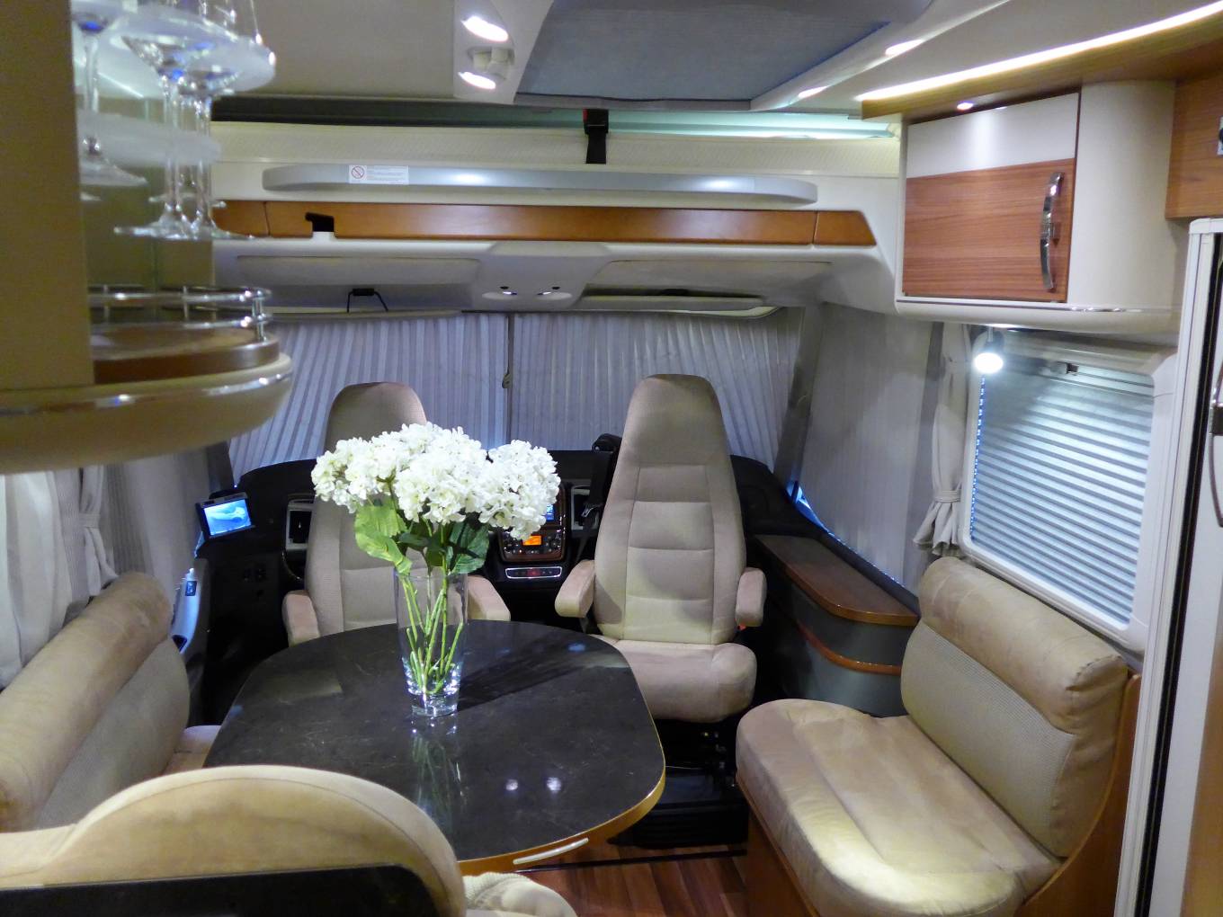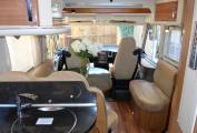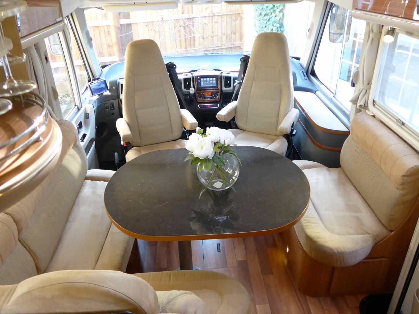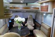 Living area with large L shaped lounge, opposing side sofa and two captions swivel chairs. Fully adjustable dining table. Hidden TV which easily drops down into lounge or swivels for kitchen or bedroom viewing. Reading lights, overhead storage, large skylight and twin chrome inverter power points. 4 seat belts, removable carpets and concertina pleated cab blinds.