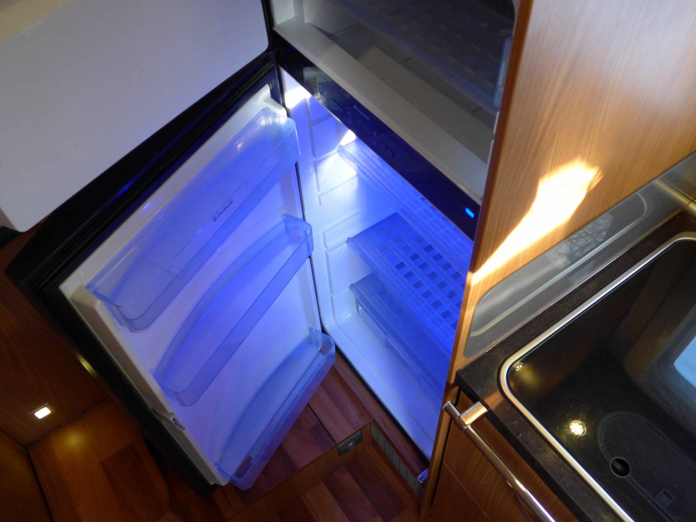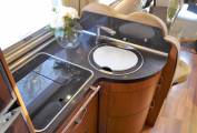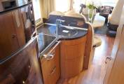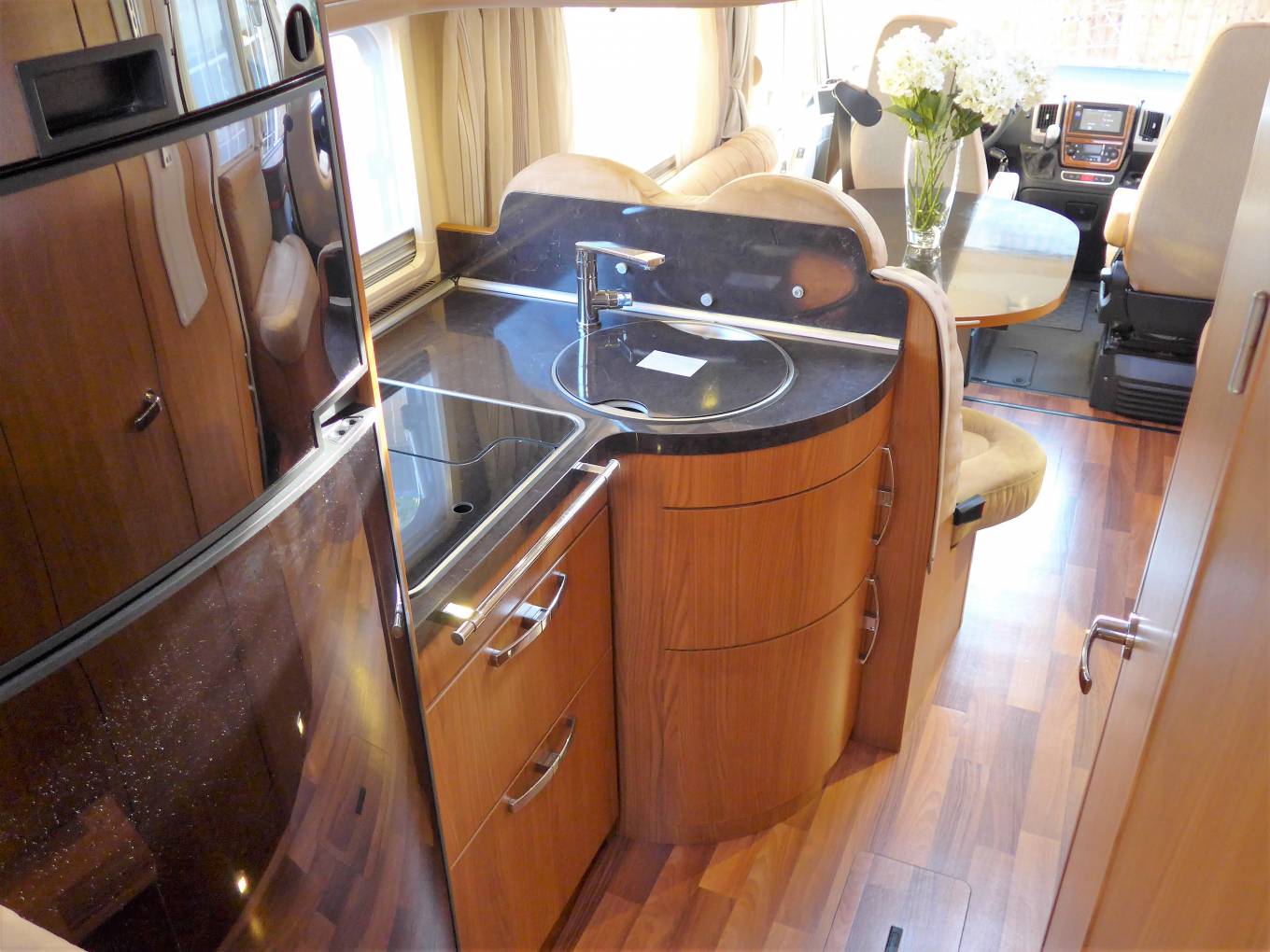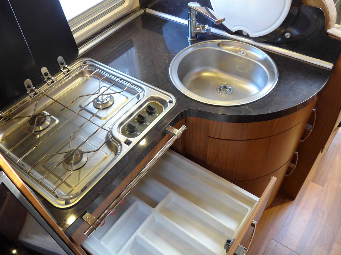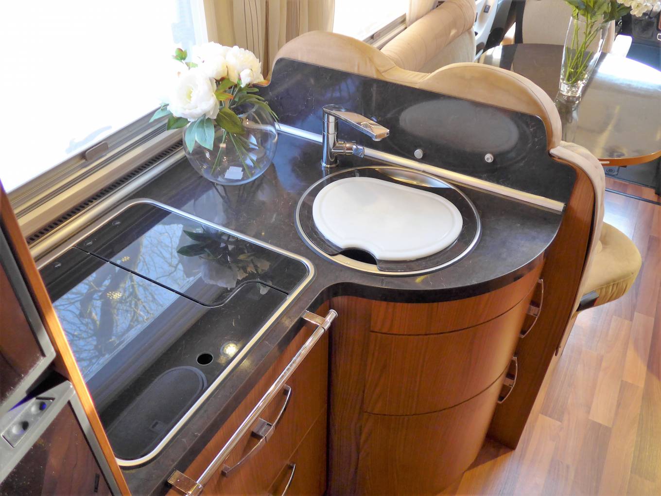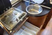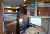 Fully functional L shaped kitchen with stainless steel sink, hob and extractor. Large automatic 3 way Fridge with separate Freezer, Combined Oven, Grill. and wall mounted Motorhome lighting control unit,