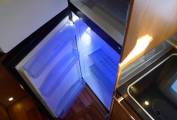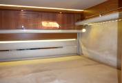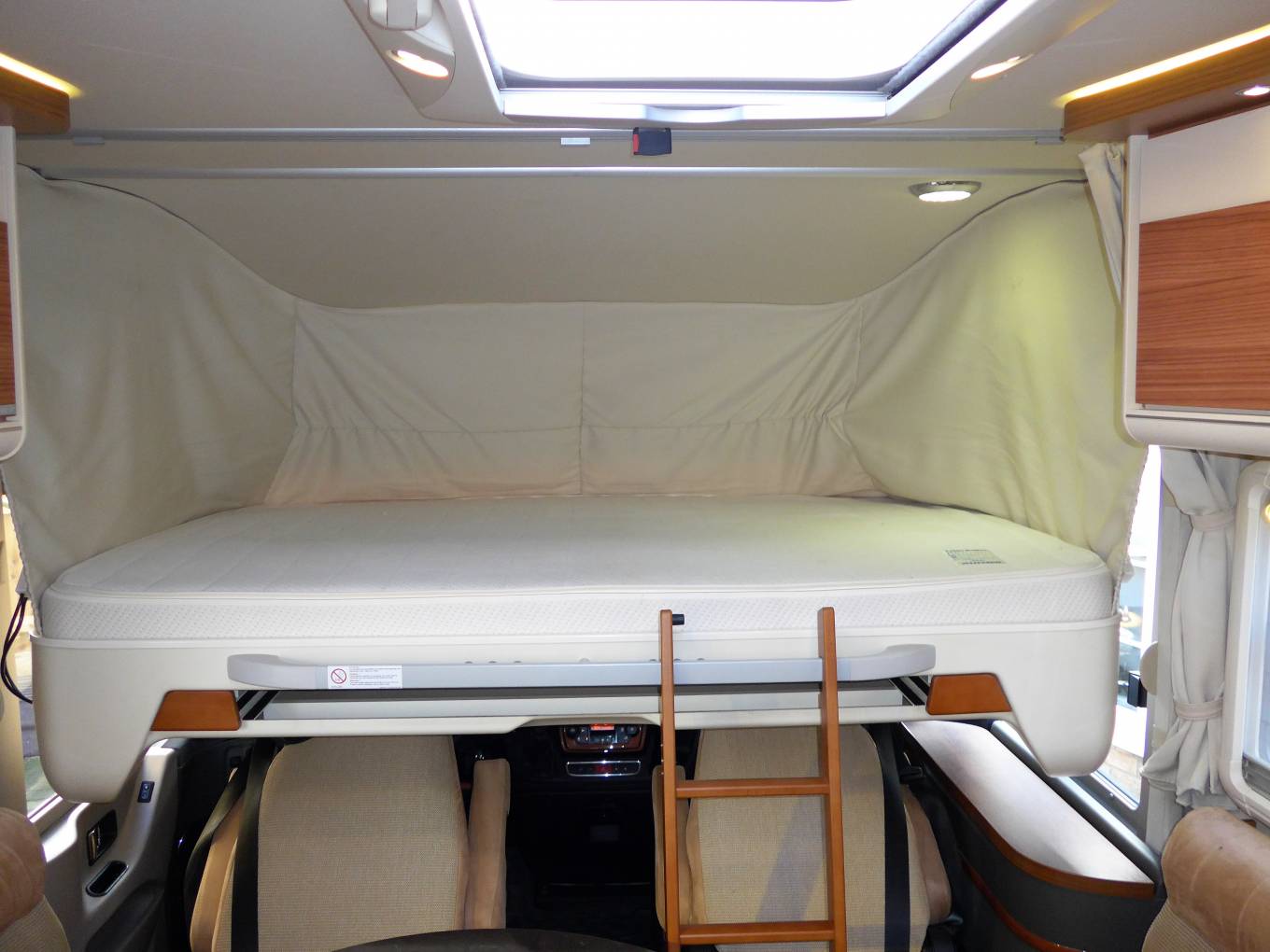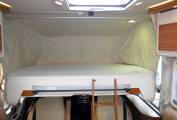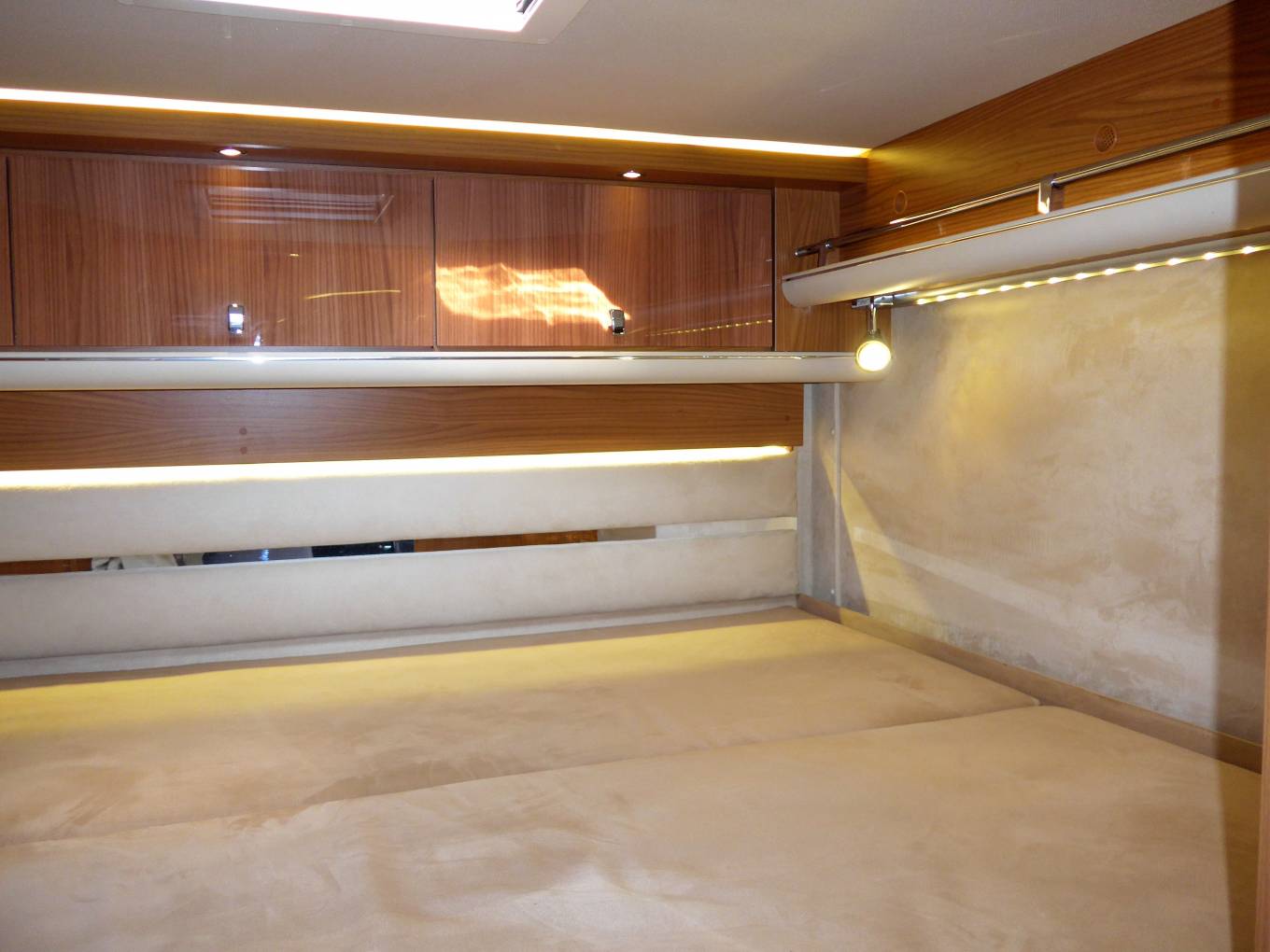 Large double fixed rear bed with Motorhome lighting control unit, storage, shelving, reading lamps, window and skylight. Large and comfortable Drop down bed in Cab area with motorhome lighting control unit, reading lamps and lutton ladder that stows awy in the bed base