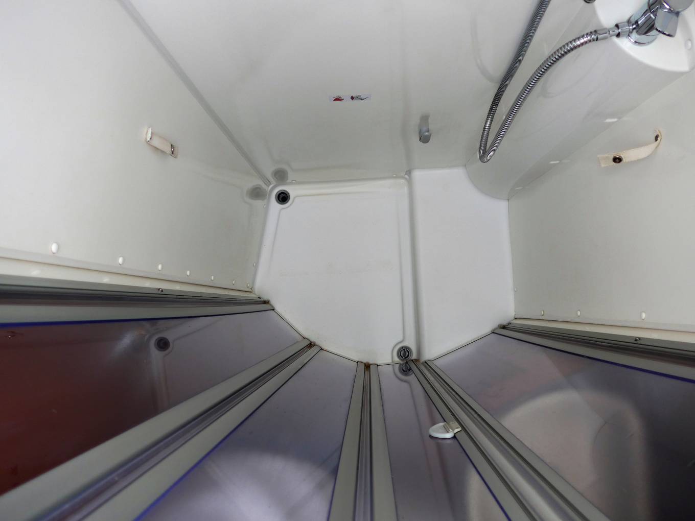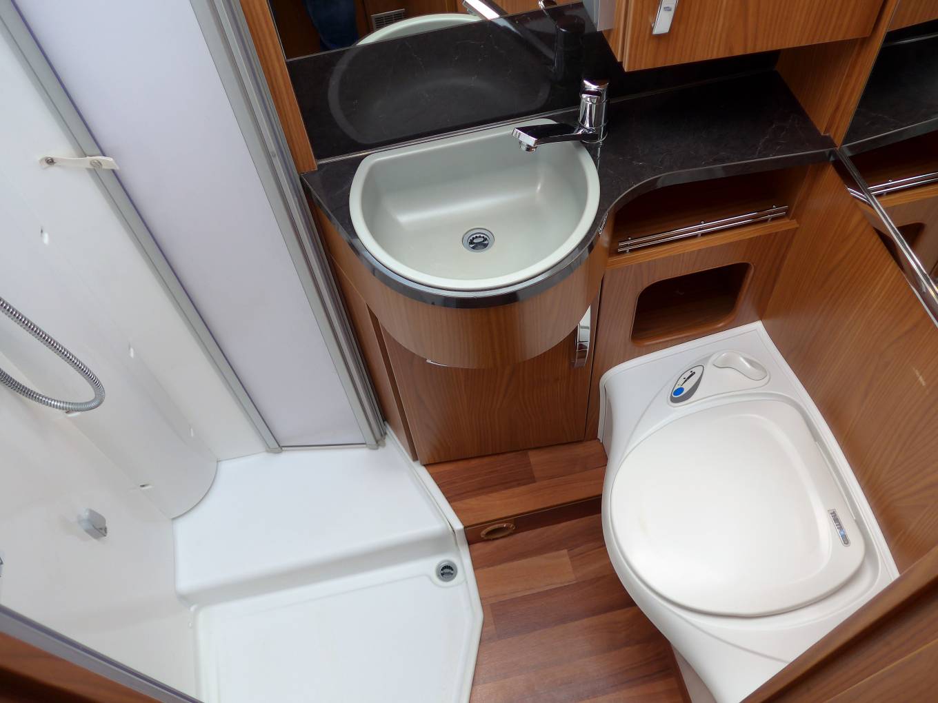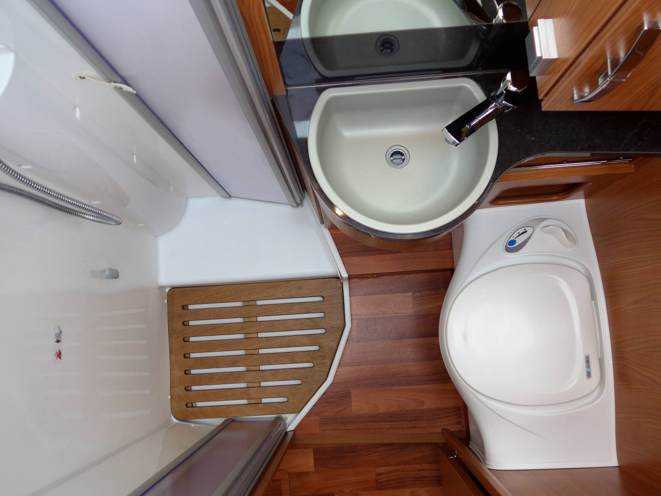 Large Washroom with Separate Shower cubicle, Thetford Cassette Toilet and washbasin and large skylight for plenty of daylight.