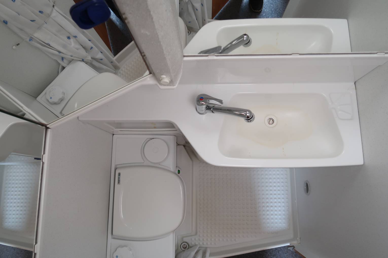 Internally it has the ever popular end kitchen layout with a gas oven and grill, a 3 gas burner hob, a 3 way fridge with ice box and a sink with a mixer tap. There is storage space in the overhead lockers and also in a ground level cupboard. Next to the kitchen is the spacious washroom which has a cassette toilet, a wash basin, a large mirror and a generous cupboard to store your toiletries. The showerhead is built into the tap. Next to the washroom is a large cupboard with a hanging rail for your clothes.