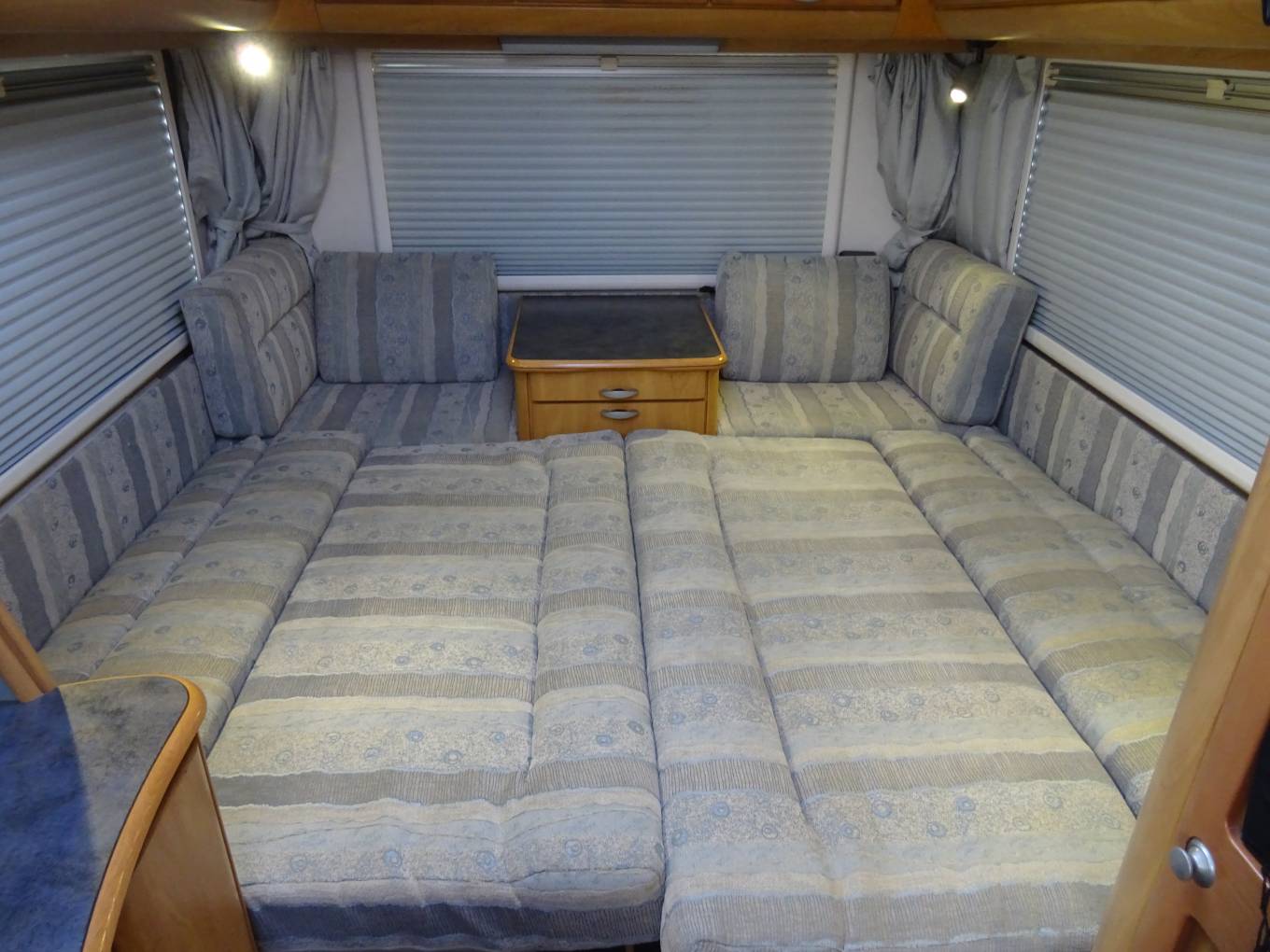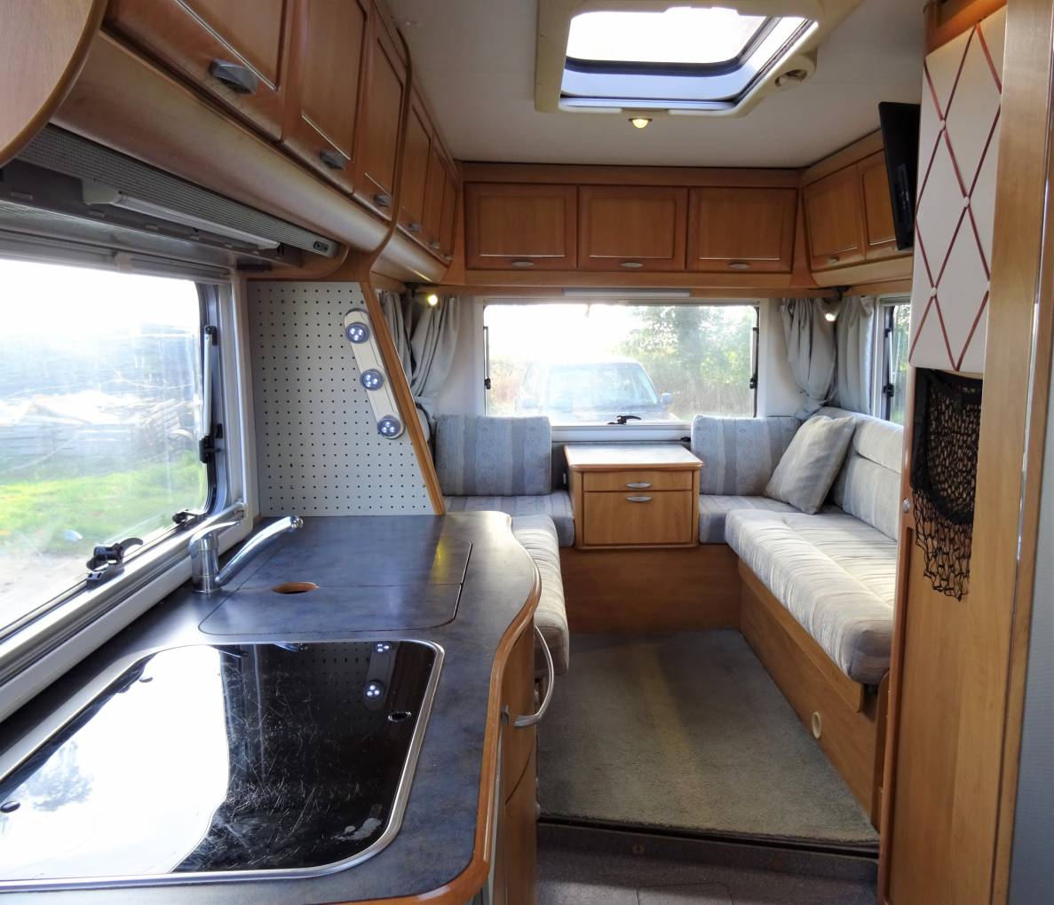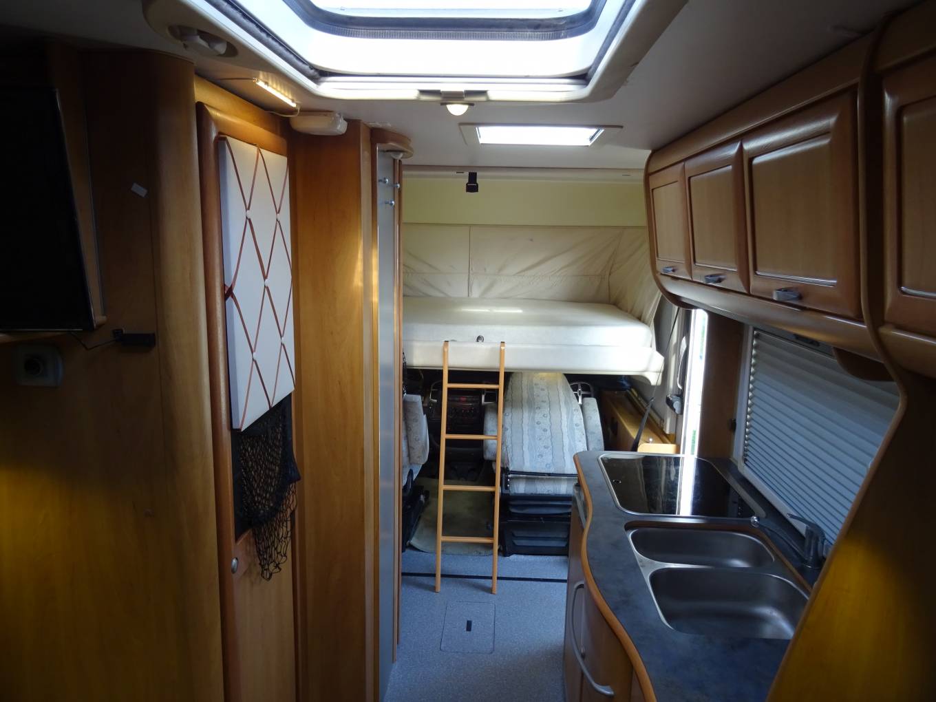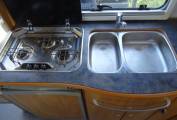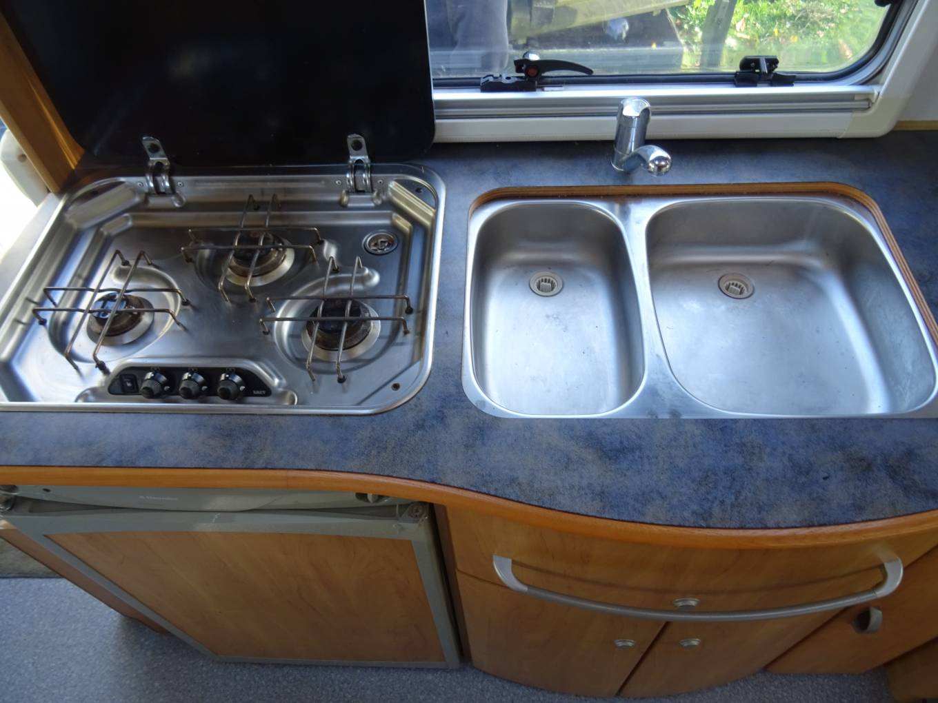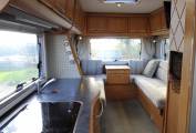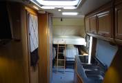 On the near side is a bathroom behind the cab, with a toilet, hand basin and shower, followed by a storage cupboard. Opposite is the habitation door and the kitchen area comprising a hob with three gas burners, a double sink with mixer tap and a fridge with a freezer compartment. At the rear of this motorhome is a large lounge area with two opposing bench seats which can be used as two singles or converted into a large double bed. Above the cab is a pull down double bed to complete the 4 berths.