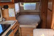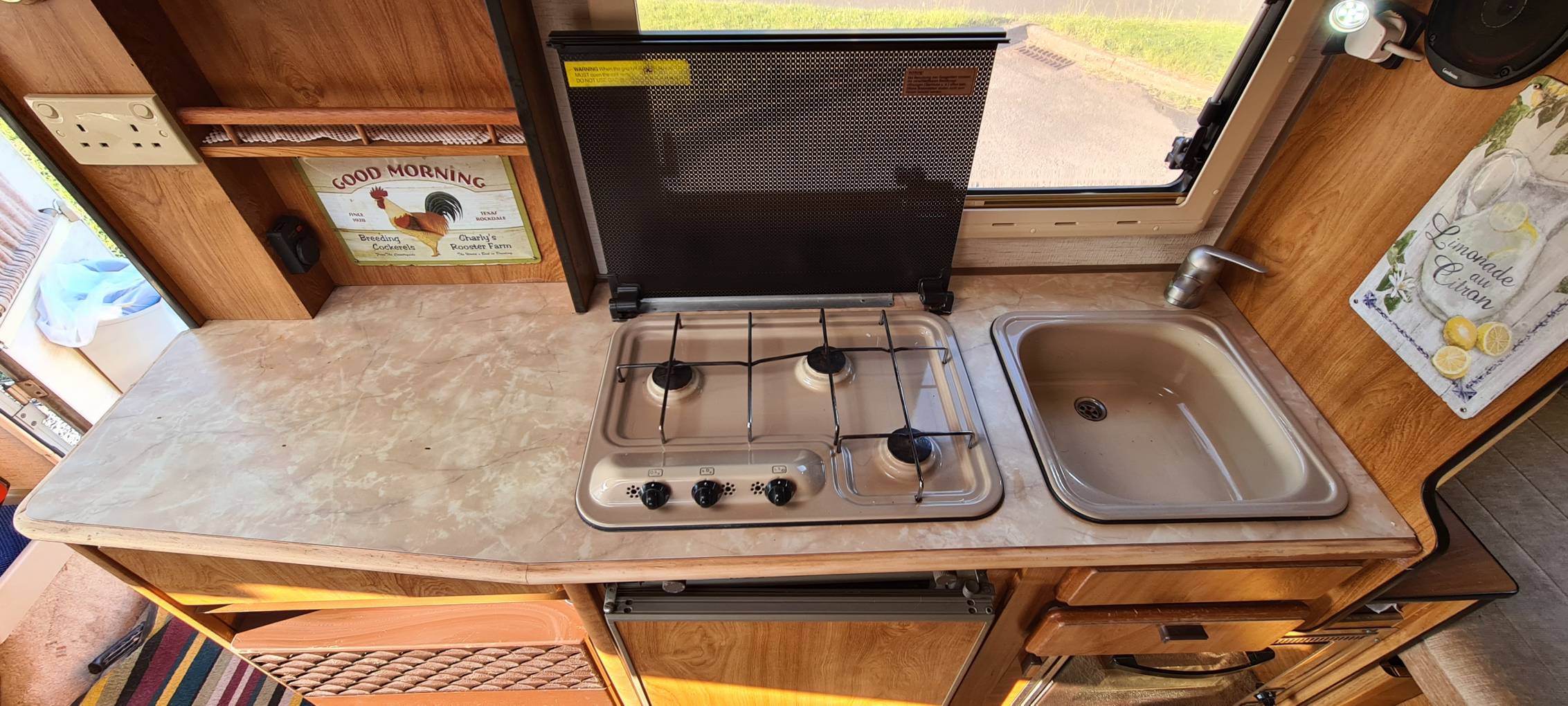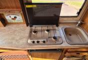 It sleeps 6 with a drop down bed to the front, a rear fixed bed and double which is converted from the dinette seating. The kitchen features a 3 ring gas burner hob with a oven and grill, a 3 way fridge and a microwave, with plenty of worktop space for preparation of food and drinks. There is a washroom with a shower, basin and toilet o the rear of the vehicle.