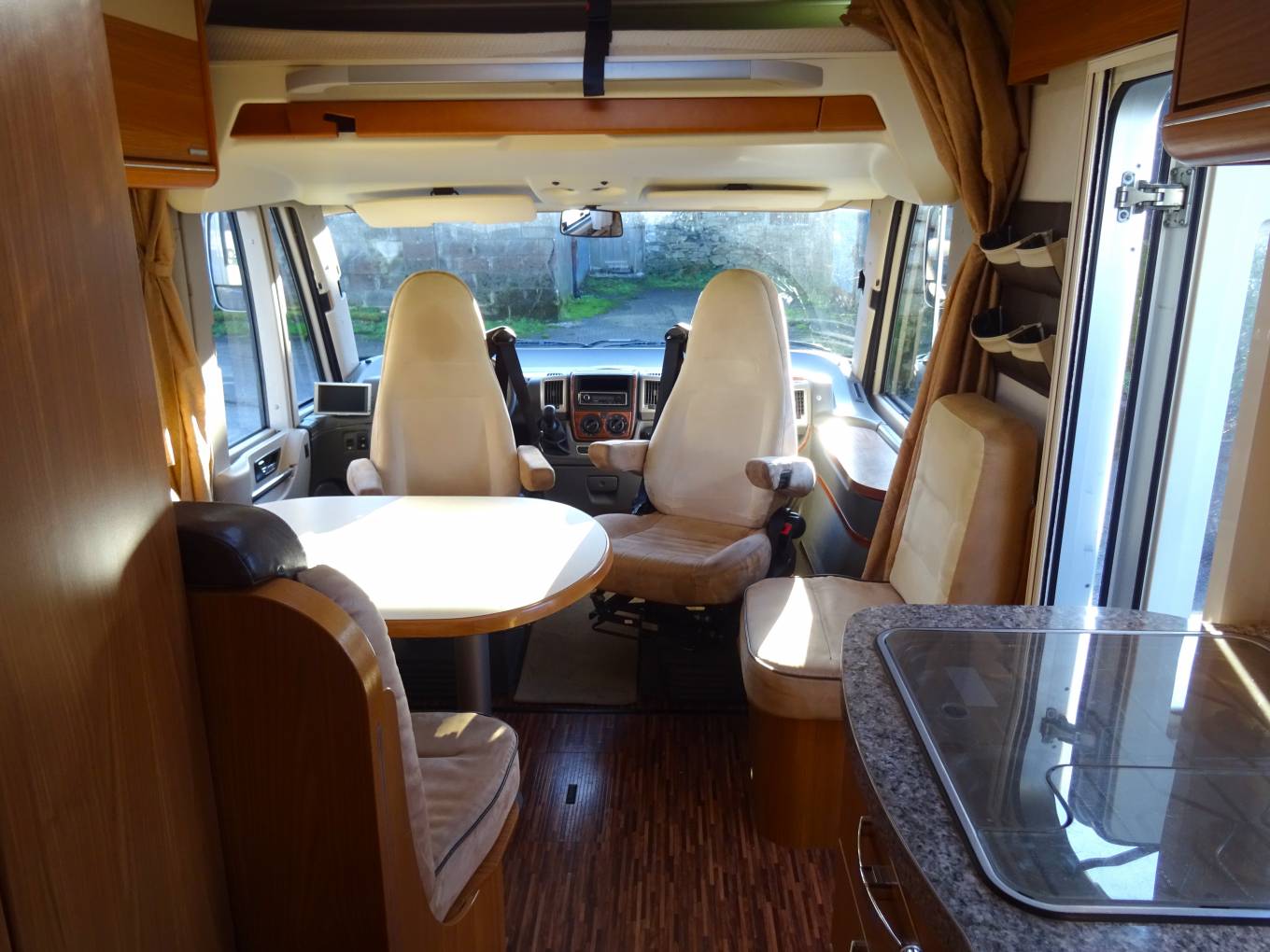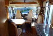 forward is the dinette and swivel cab seats. With the cab seats swivelled, there is
