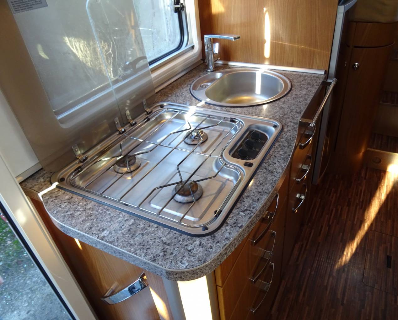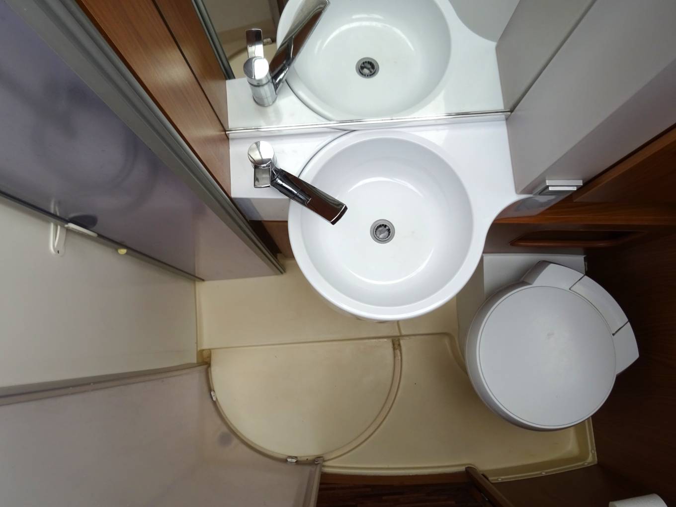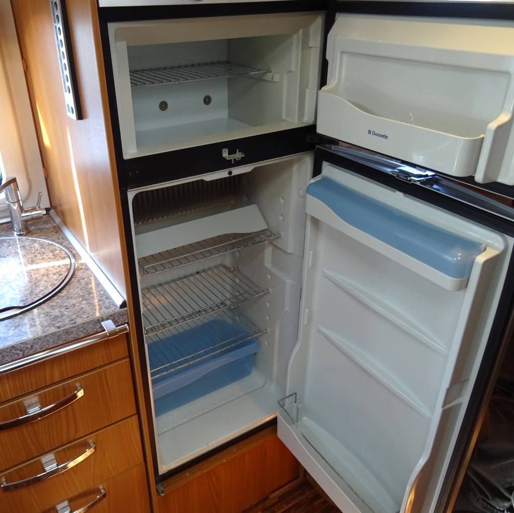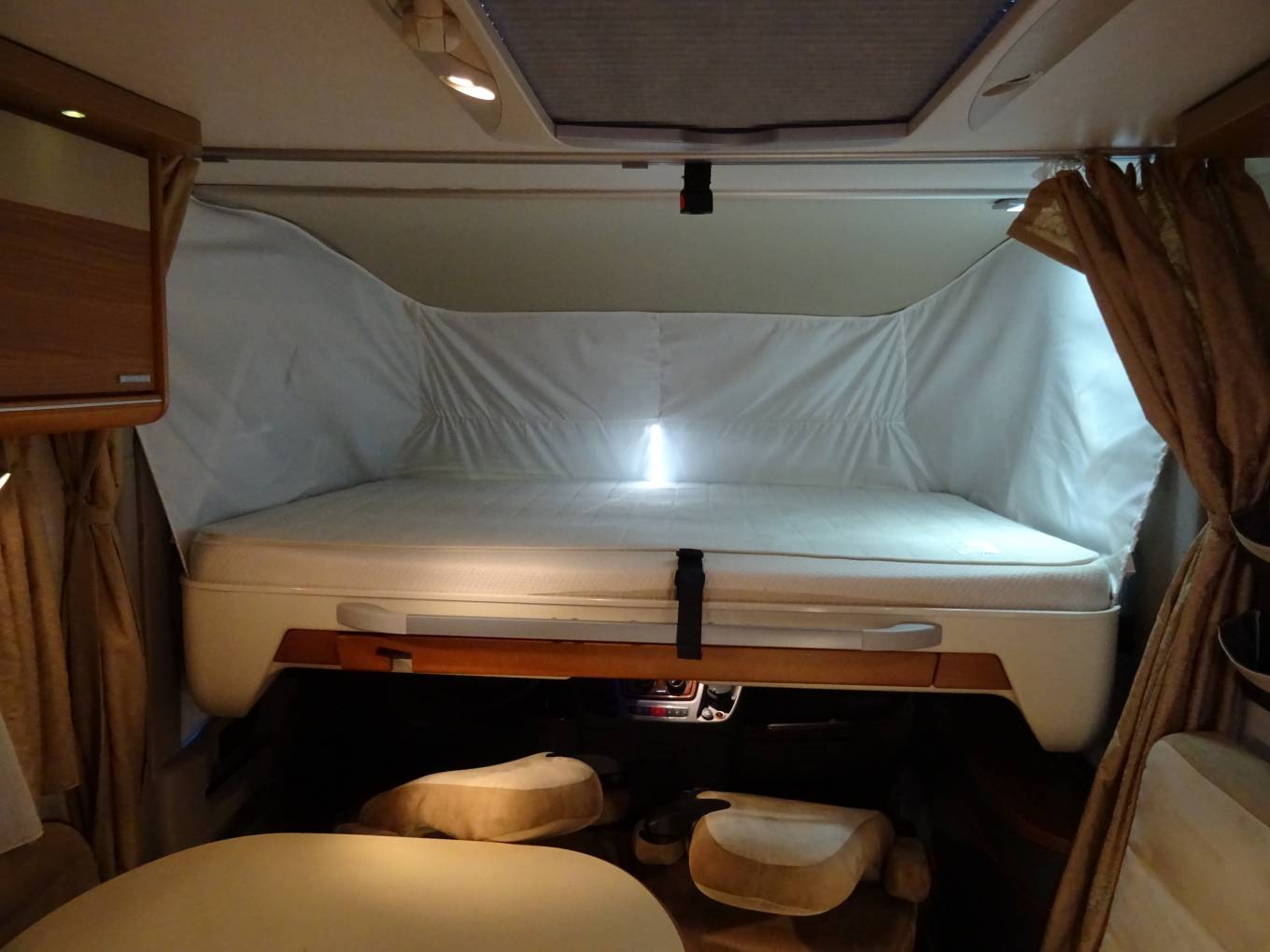 drop down double bed over cab area providing comfortable large sleeping areas. Mid ship there is a washroom with sink, shower and toilet. Opposite is the central kitchen,
