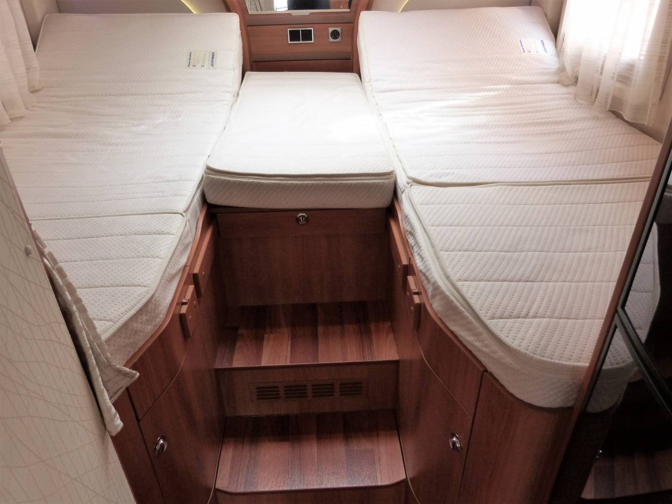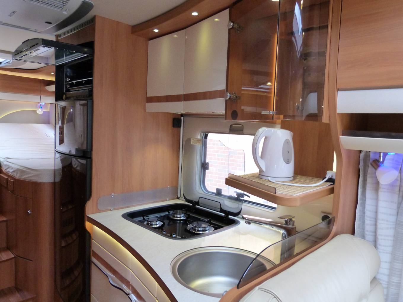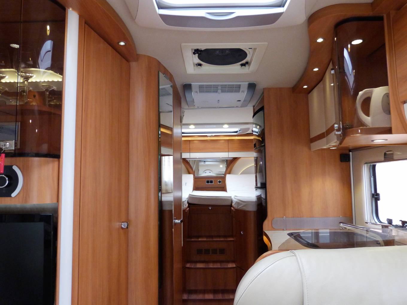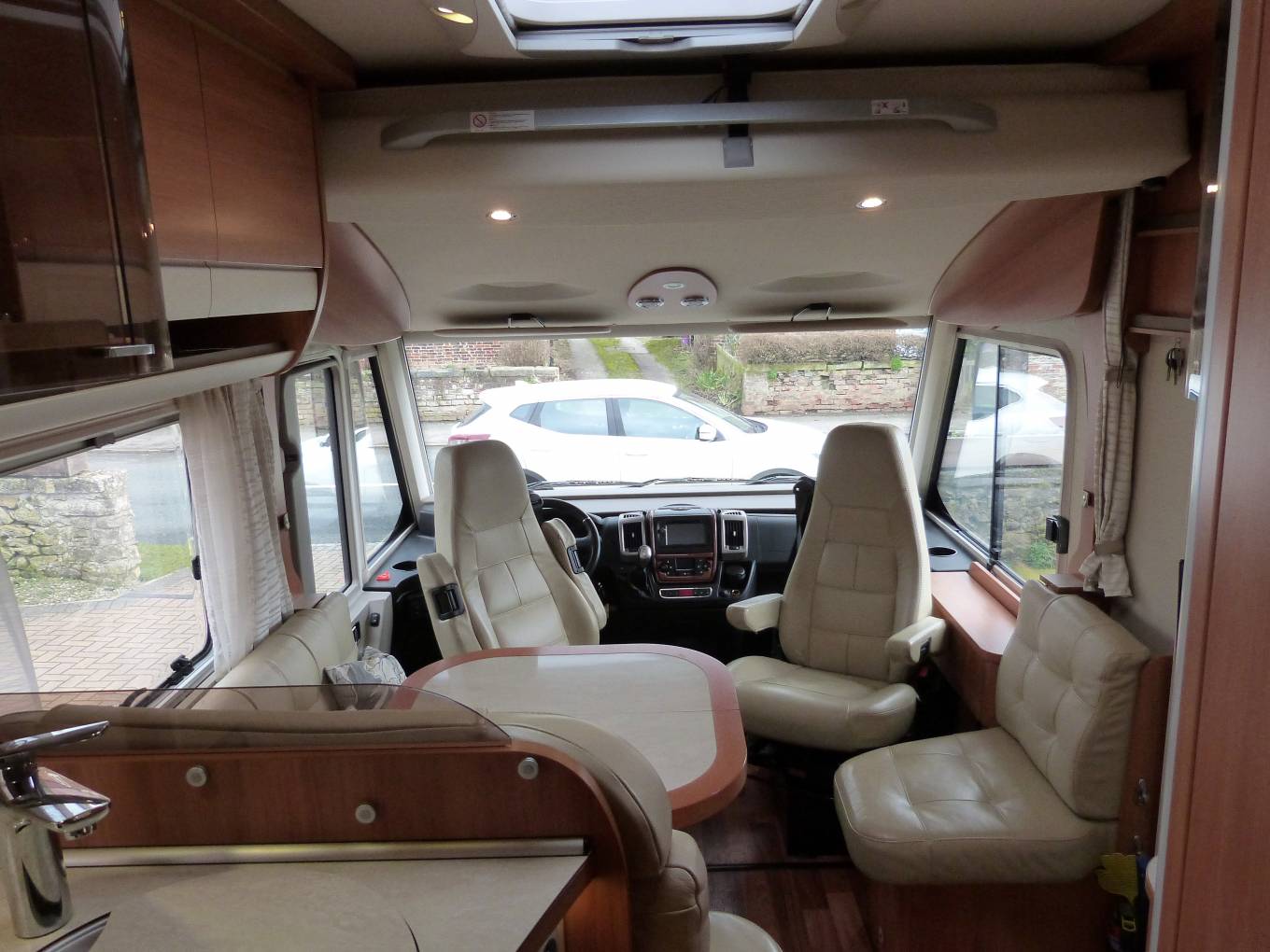Call with any questions on 01423 609985. This is a superb example of a luxury coachbuilt motorhome that exudes quality throughout. This A class, 4 berth Hymer B674 SL, sits on a Fiat Ducato chassis, has a powerful 160bhp, 2999cc engine, automatic gearbox and is ideal for touring Continental Europe being left hand drive. It has travelled only 43,750 miles and is excellent condition both inside and out, with an impressive list of additional features, that personify the class workmanship of Hymer. The equivalent model, bought today, would be circa £ 105,000 plus taxes. The standout features include: the large garage at the rear, which will easily store bikes if required, above which are the 2 single beds or a generous double; full leather upholstery, drop-down bed over the cab which has not been used by any of the owners, which means 4 people can sleep in real comfort. There is an exceptional level of storage throughout and clever features to maximise space such as cupboards under the bed. The rear of each bed can be electronically raised to provide greater comfort when reading or watching 1 of the 2 on board TV’s. The washroom has a toilet, sink and enclosed shower cubicle. The kitchen has a large Dometic Tec Tower fridge with freezer above, sink, 3 burner gas hob and oven with grill. The front lounge has soft leather seating for 5 adults by use of the swivel seats and the travelling seat opposite. There are 2 additional seatbelts and a TV is also situated in this area. The motorhome is fully winterized, with Alde central heating to keep you warm in winter and habitation air conditioning will keep you cool in summer. In the cab, there is a Panasonic media centre including Bluetooth, sat nav and rear-view camera and to enable comfortable, easy driving it has full air conditioning and cruise control; above is the drop-down bed and you will never miss any scenery with that view that only an A class can provide. The long list of additional features include, that is chain driven so no cambelt issues, rear air ride suspension, Goldshmit front suspension, Oyster satellite system, 2 x 100W solar panel, 2 leisure batteries, 1500W inverter to run 3 x 240V 3 pin plugs, external BBQ point,within the garage a hot and cold shower full length awning and tow bar. For security there is a tracker, alarm, immobiliser and deadlocks on the habitation and driver’s door. Nice little touches, the cupboard doors in the kitchen can be locked whilst travelling, heating can be supplied to the habitation are whilst driving, the engine has a warm start facility, wide habitation entry door with low level steps, electric drop down cupboard in the kitchen and an integrated vacuum cleaner that stretches the full length if the motorhome. It has a good level of service history, up to date habitation report, so will come with a warranty. This golden coloured Hymer is fantastic and should be seen at the earliest opportunity near Ripon. Call for further information and an extensive picture file, quoting reference number 143768
