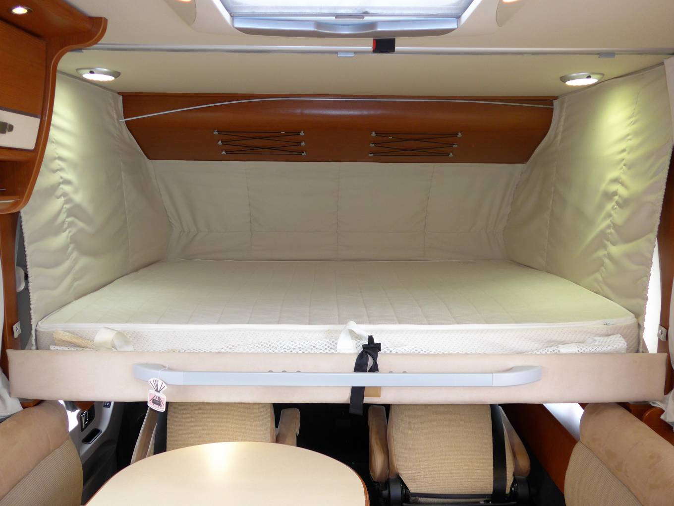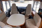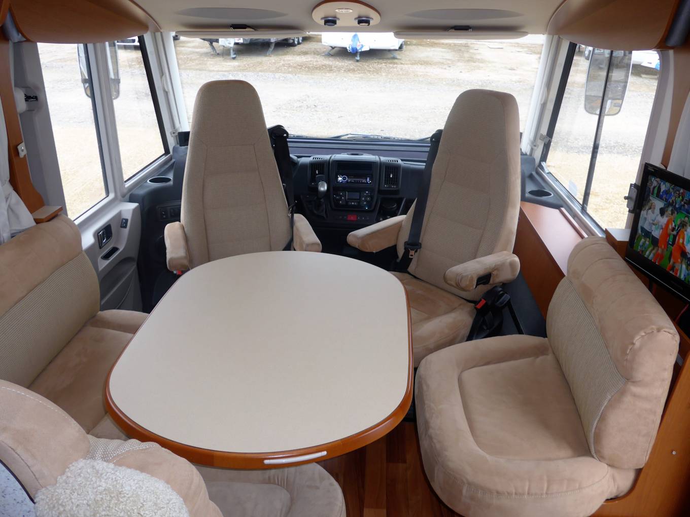 L Shaped Lounge with adjustable dining table and small side sofa. ISRI Swivel captions seats and pop TV and drinks cabinet make for a comfortable living area. Above is large and comfortable pull down bed with privacy curtains.