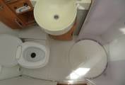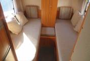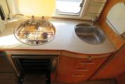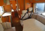 This Hymer B774 is a 5 berth tourer with 4 three point seat belts and one side facing lap belt. The front captains seats both swivel to create a large dinning/lounge area around the adjustable tear-drop galley table, there is also a small sofa which can double up as a small bed. The two front seats drop forward to allow the large double pull down bed to be accessed via a small ladder. The well equipped kitchen is in the centre of the van with a 3 burner gas hob, sink with mixer tap and cover/chopping board, there is a combination oven/grill and a large fridge with separate freezer compartment. Opposite the kitchen is the large washroom with a swivel cassette toilet, wash basin with two large mirrors above, a number of storage cupboards and a separate shower enclosure. To the rear of the van are the two fixed single beds these can lift to give access to the garage space. Above the beds are a number of high level storage cupboards and a large wardrobe to the centre.