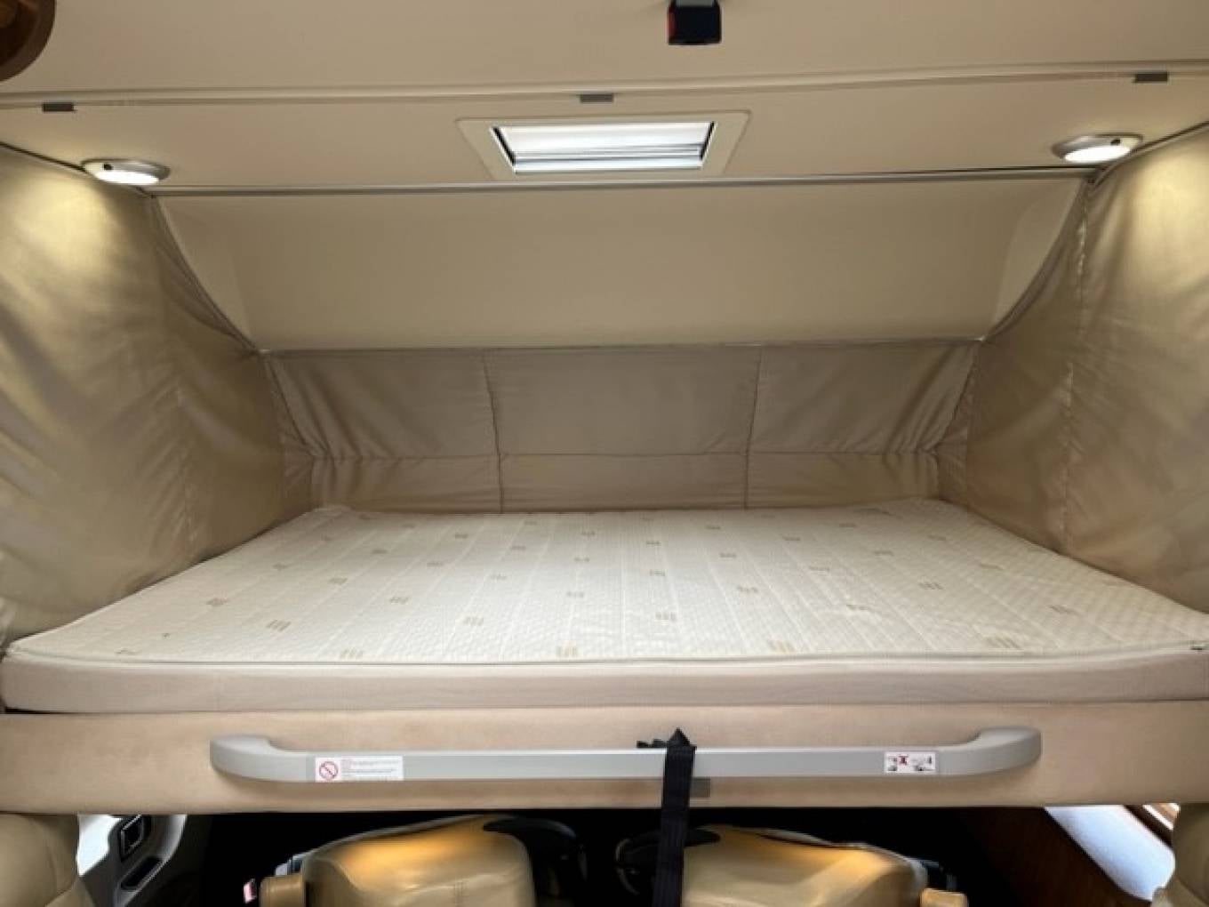 Sleeping is via the Rear Twin Beds which in seconds can also be made into a Very Large Kings Size with Ladder. The Drop Down Cab Bed provides an additional Large Comfortable Double
