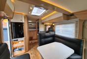 The Lounge area is flooded with light, courtesy of the skylight above and can comfortably seat up to 6 adult diners when utilising the swivelling captain's seats. There is a large screen Axtex TV included which rotates into the perfect viewing position