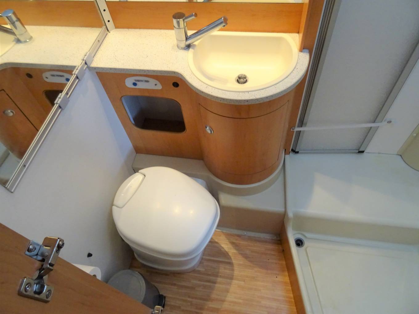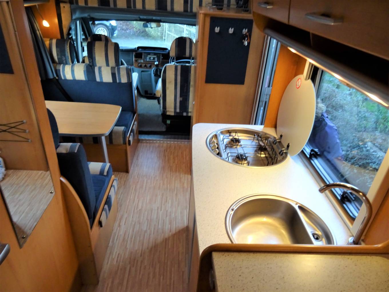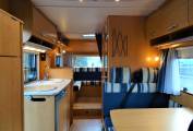 As you enter the door of the MH into the central dinette you will find a 4 seat booth with a removable table, also in the centre of the MH you will find the kitchen which has a sink with mixer tap, a 3-way fridge and a 3-burner hob. In the washroom you have a sink with taps, toilet cassette and a separate shower cubicle.