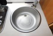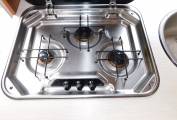 The kitchen has a round stainless steel sink with chrome mixer tap, the hob has a glass lid and 3 gas burners, below is a three-way powered fridge with ice-box, plus there are upper and lower cabinets to store away your holiday provisions.