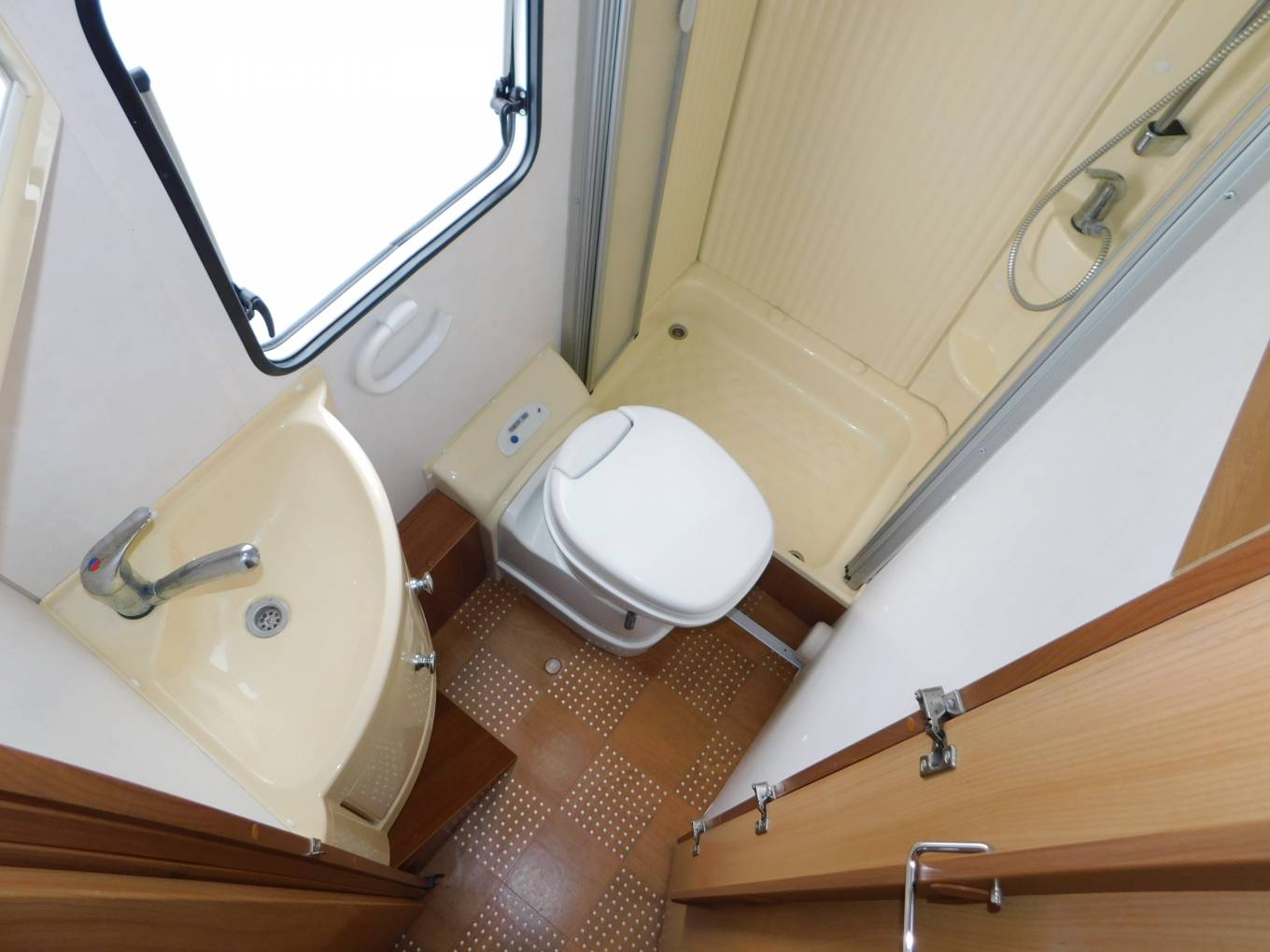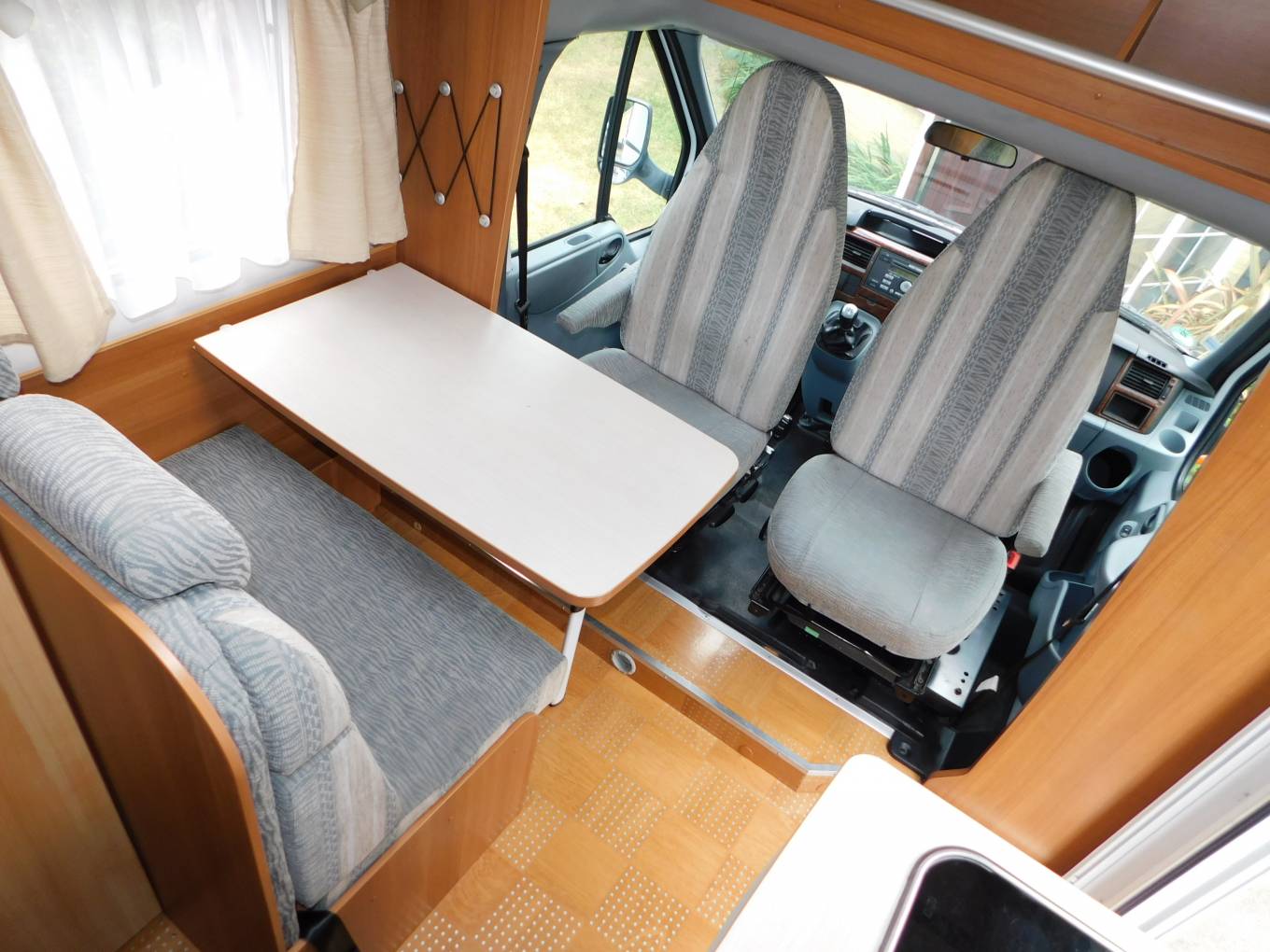 The washroom is large and has a separate shower cubicle with perspex doors. a built-in wash-basin with mixer tap and a Thetford cassette swivelling toilet with electric flush. The cab has air conditioning, a Ford CD Tuner, cruise control, electric windows, mirrors, central locking and swivelling seats.