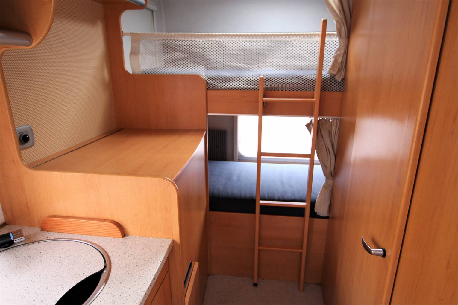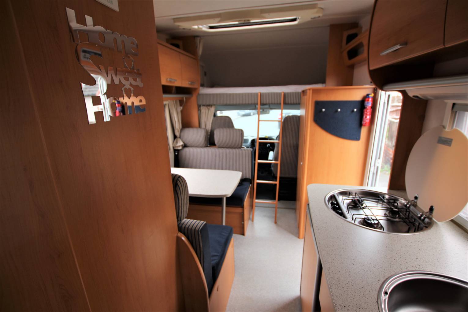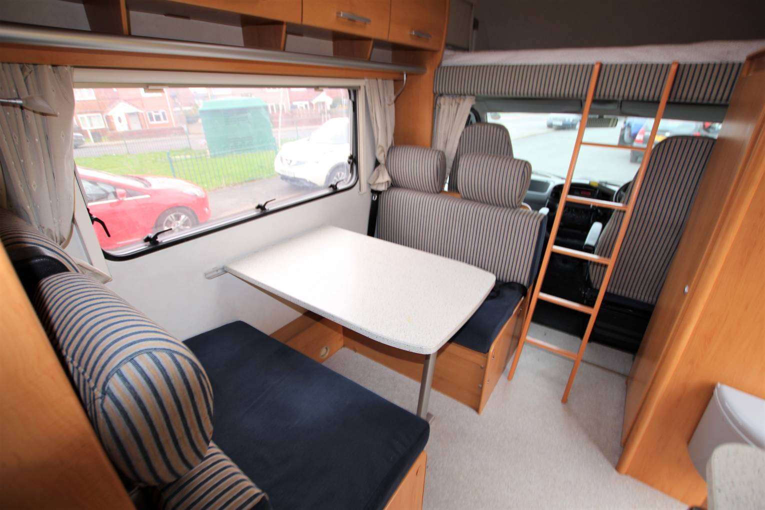 Sleeping is via the King Size Over cab Bed, Twin Adult Size Bunks to the rear plus the Dinette Converts to make a further Double - please note the bottom bunk can be raised to increase the capacity of the garage space.