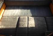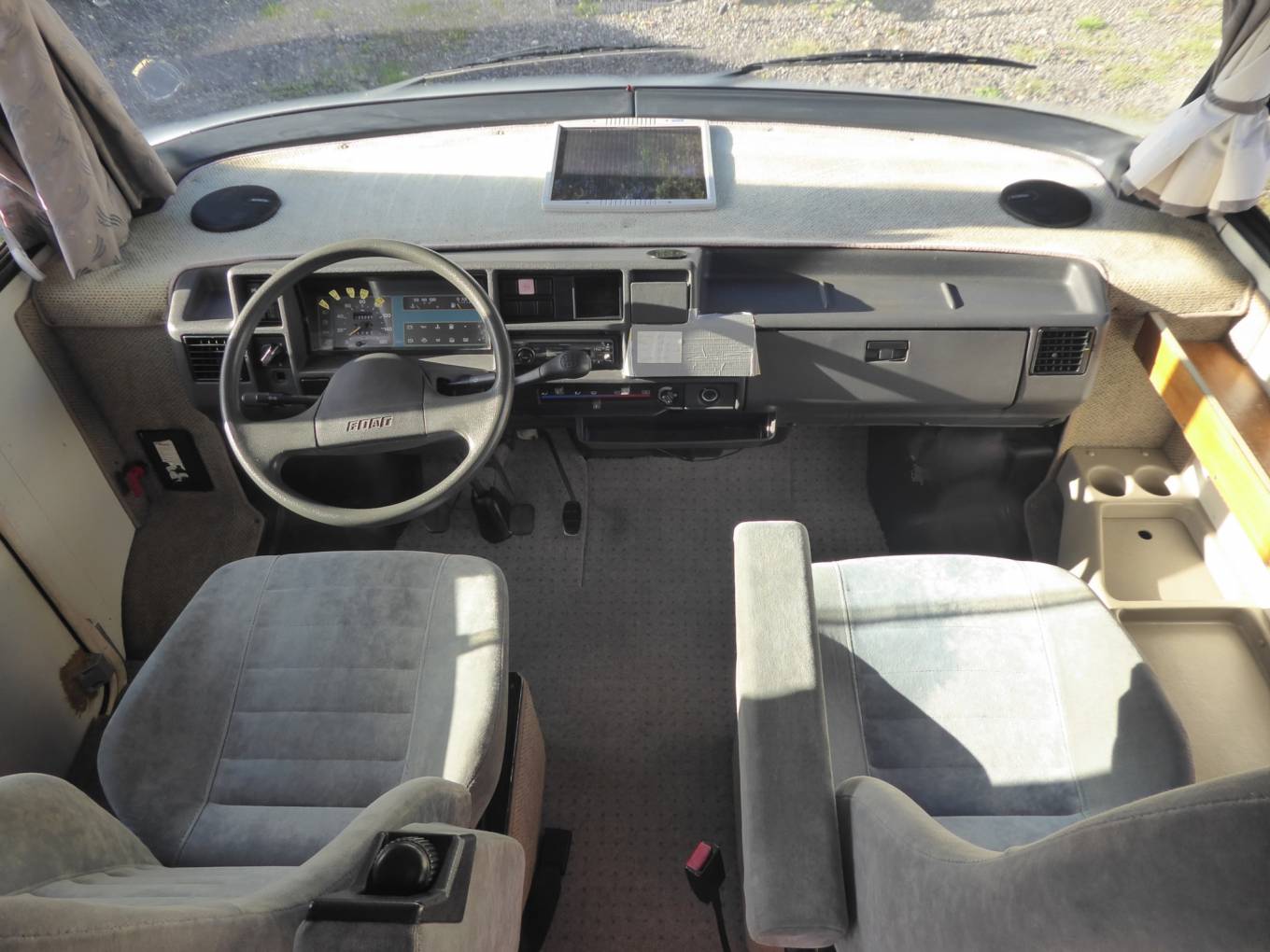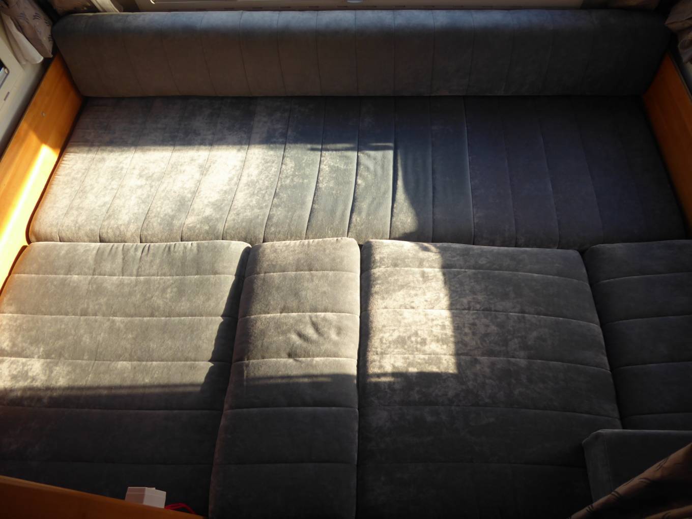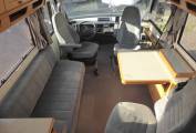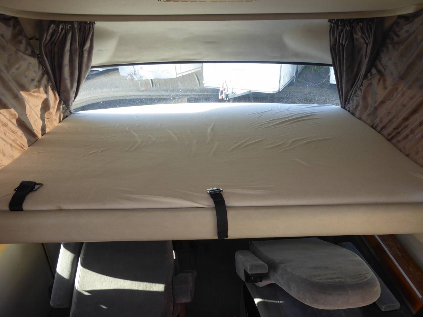 The front dinette will seat 6 in comfort, the sofa will make into a single bed, and a large drop-down bed over the cab.