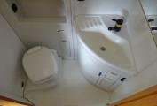 End washroom with toilet and vanity basin, opposite a separate shower room.