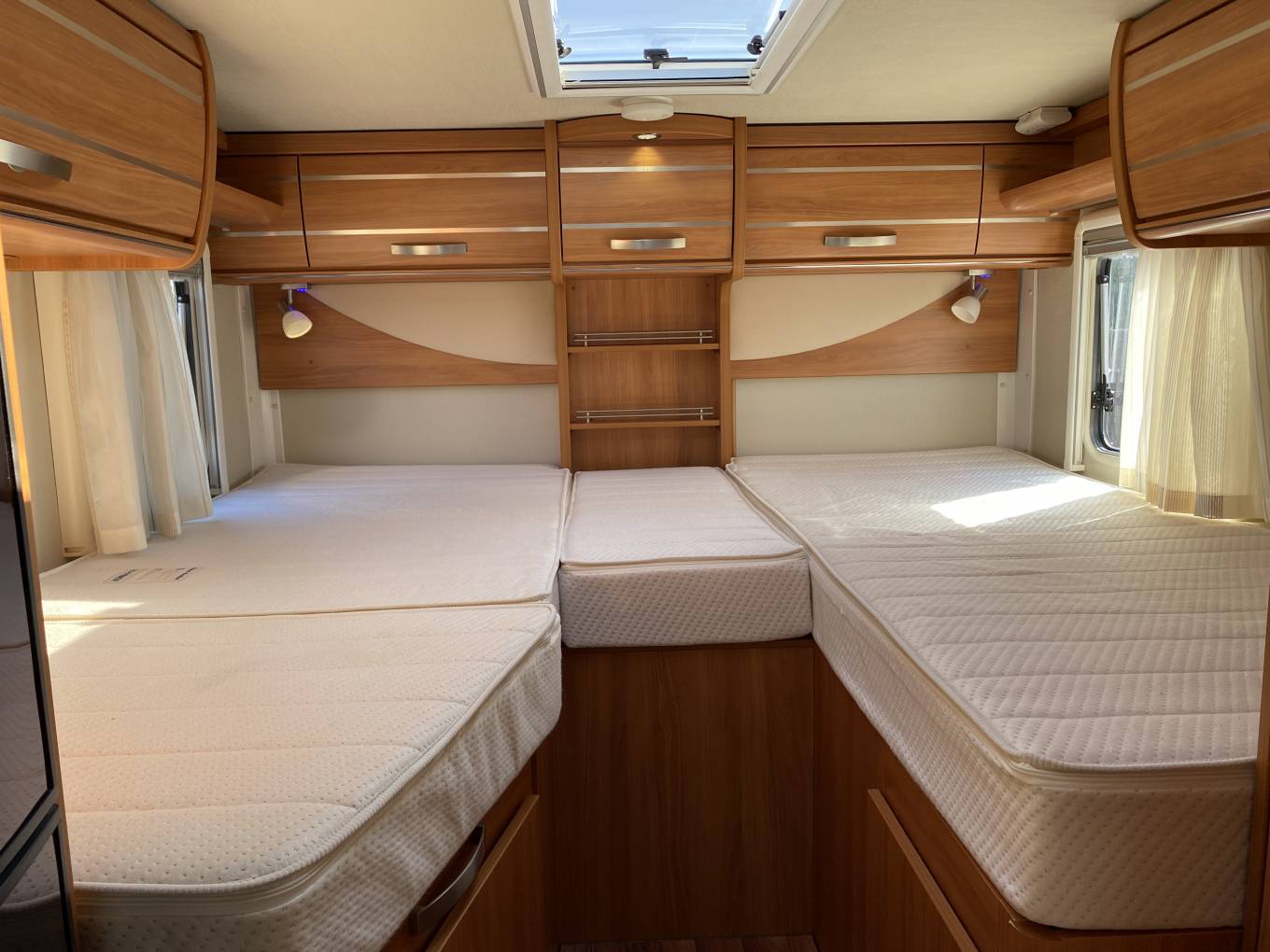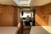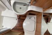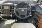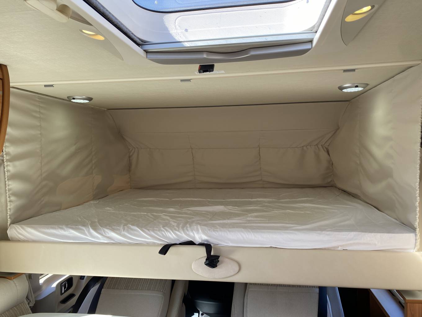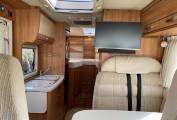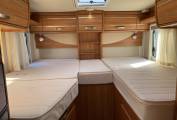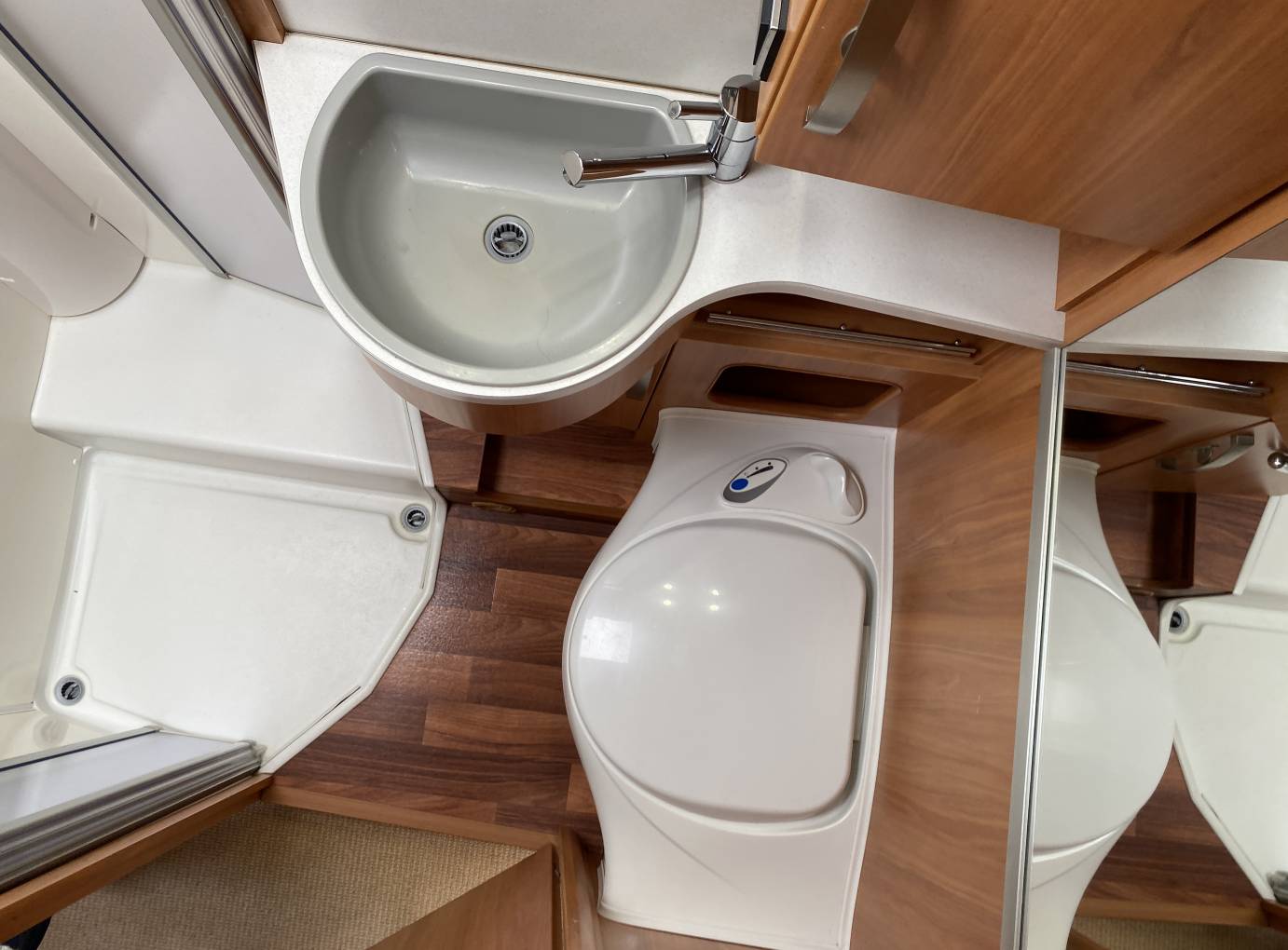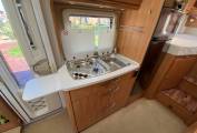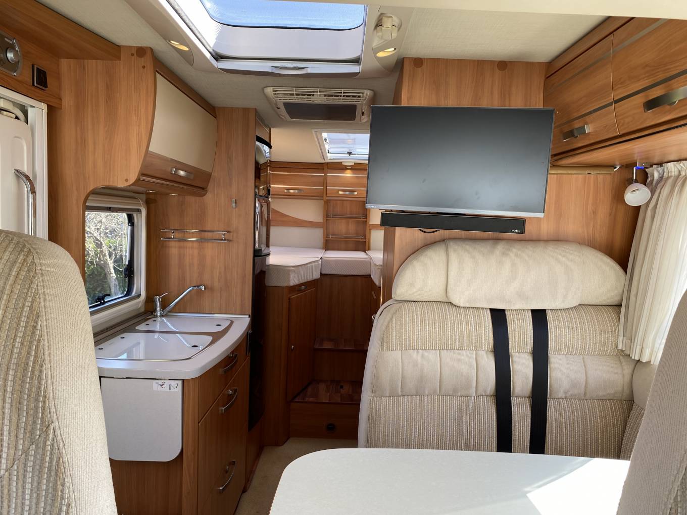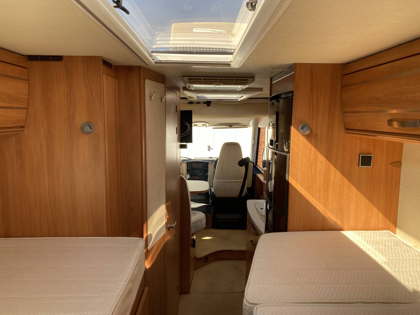 This is a 4 berth motorhome with 4 travelling seat belts. The cab has air conditioning, cruise control, electric door mirrors, map lights, drivers and passengers airbags, CD Radio, MP3, DVD player, upgraded Snooper Sat Nav system which doubles as the screen for the reversing camera. Both the driver and passenger seats swivel to allow extra seats in the lounge/dinette area. Above the drivers cab there is a drop-down bed with two reading lights. With an extra drop-down seat and a dining table that moves in four directions, there is space for 5 or 6 people. The two forward facing seats have the 3-point seat belts. There is a Dometic air conditioning unit in the lounge area. All habitation windows have flyscreen roller blinds as well as window roller blinds. In the kitchen area there is a 3-ring gas hob, an eye level rill/oven, a large fridge and a sink with mixer tap and a lift-up worktop extension. Opposite the kitchen is the washroom which has a separate shower with folding doors, a toilet and a wash basin. An illuminated vanity mirror and large rooflight give a feeling of space and light. Moving towards the main sleeping area we have the luxury of two single beds but if a double bed is preferred then simply pop into place, the fill in panel and cushion, bought as an extra for this motorhome. There are good clothes hanging space in cupboards and storage throughout the bedroom with reading lamps on each side of the bed.