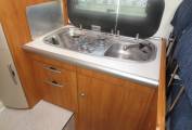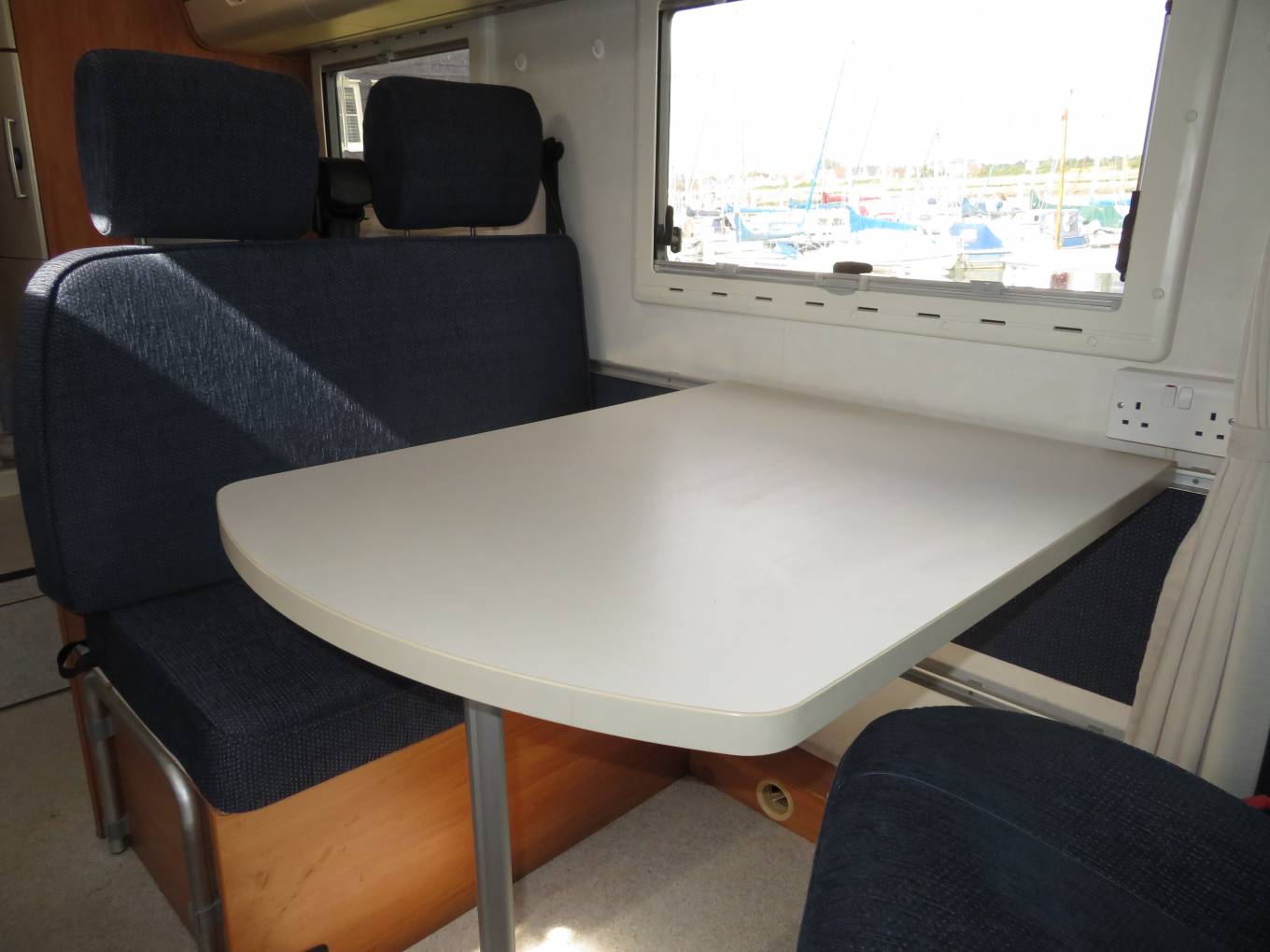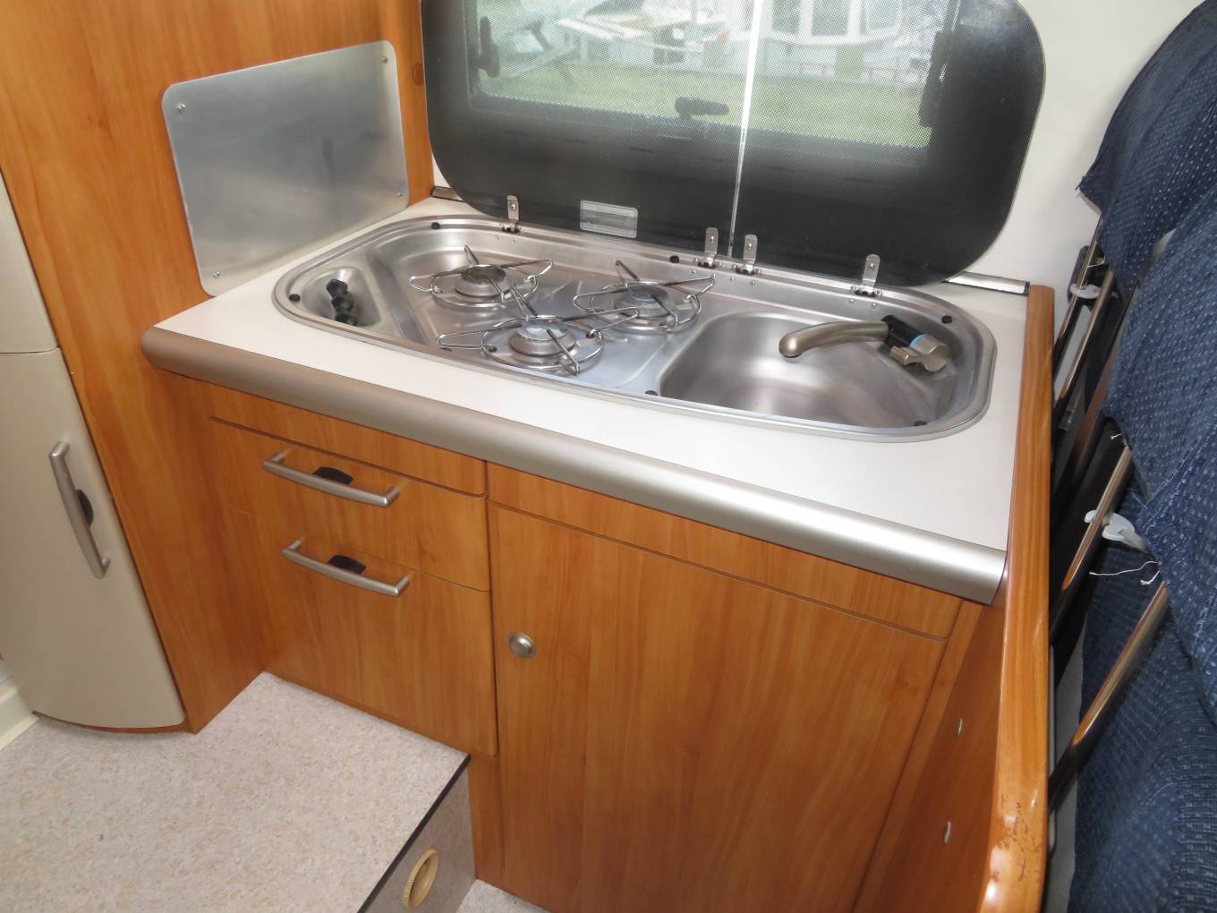 Internally the motorhome is in excellent condition and has a wonderful living space. At the front there is a good sized lounge and dining area that is made up of the two front captains chairs, one double front facing sofa and dinette table and a further double side facing sofa. This is the ideal space to put your feet up and relax or to enjoy a meal or snack. It is bright, clean and full of natural light. Moving back you have an extremely well equipped kitchen which includes oven, grill, hob with 3 gas burners, sink with mixer tap, 3-way fridge with ice compartment and plenty of cupboard and storage space for all your ingredients, utensils and pots and pans.