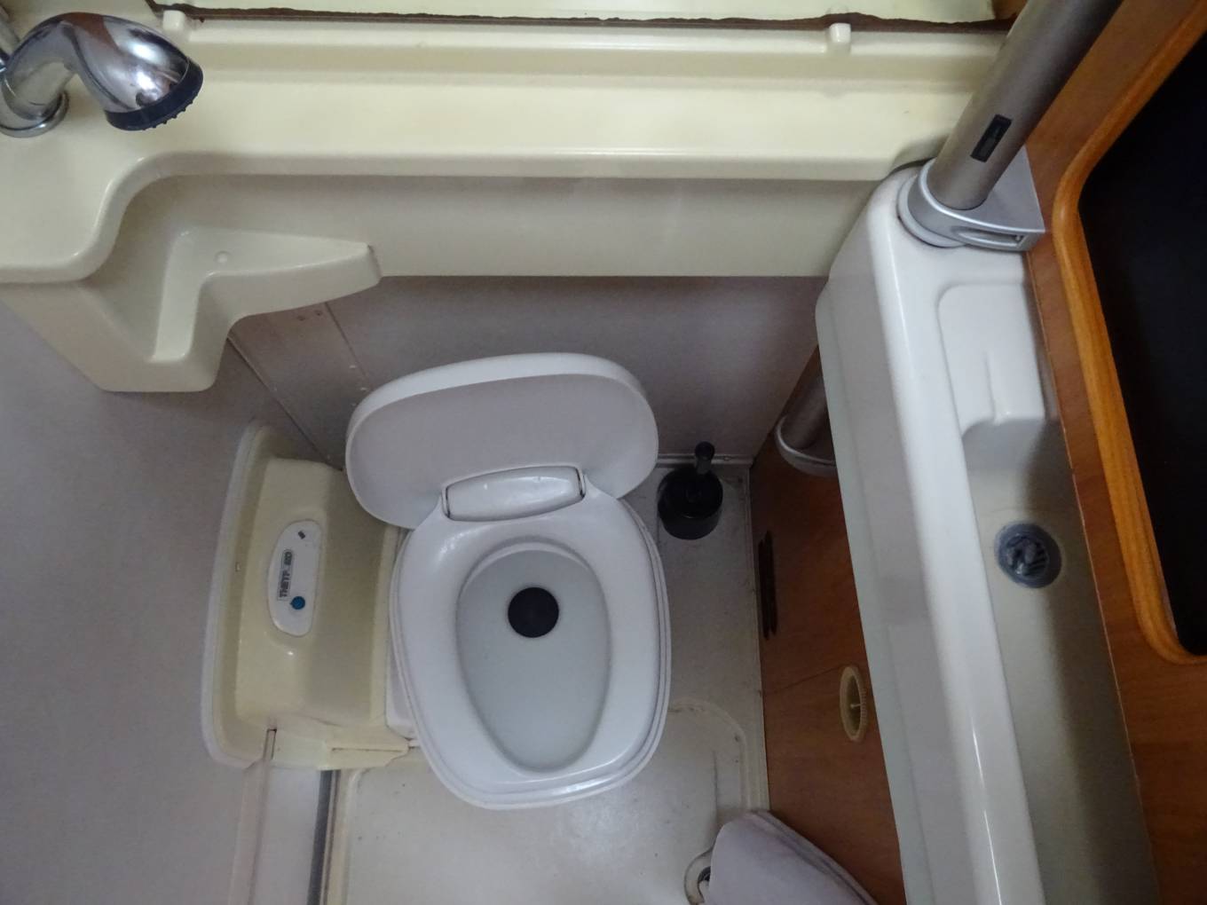 toilet, shower facility and a clever wash basin that swivels into a recess when